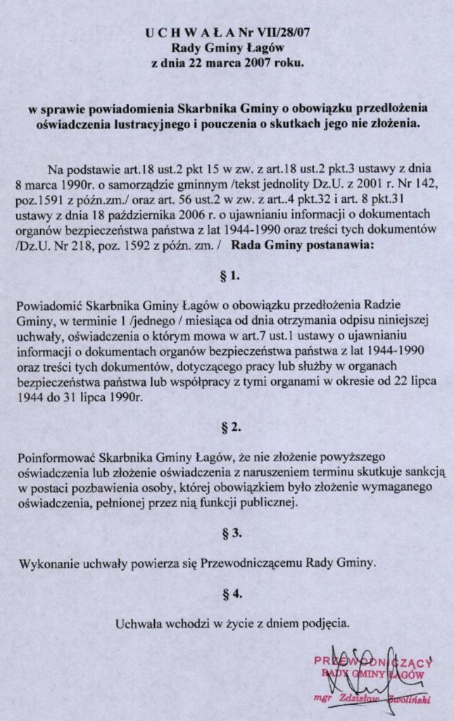 | Uchwała nr VII/28/07 Rady Gminy Łagów z dnia 22 marca 2007 r. w sprawie powiadomienia Skarbnika Gminy o obowiązku przedłożenia oświadczenia lustracyjnego i pouczenia o skutkach jego nie złożenia | 2008-08-25 |