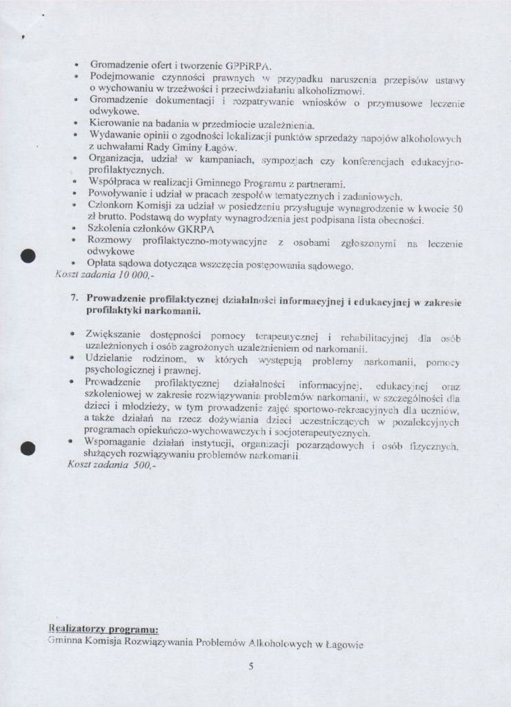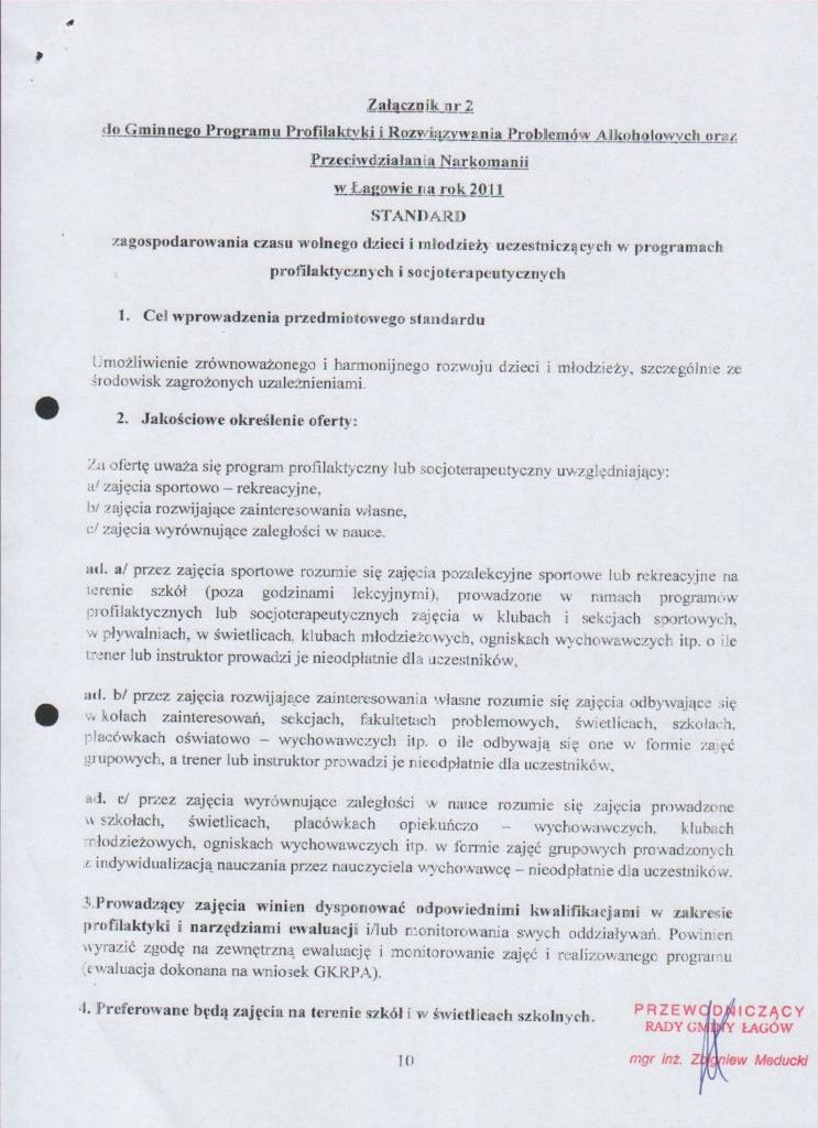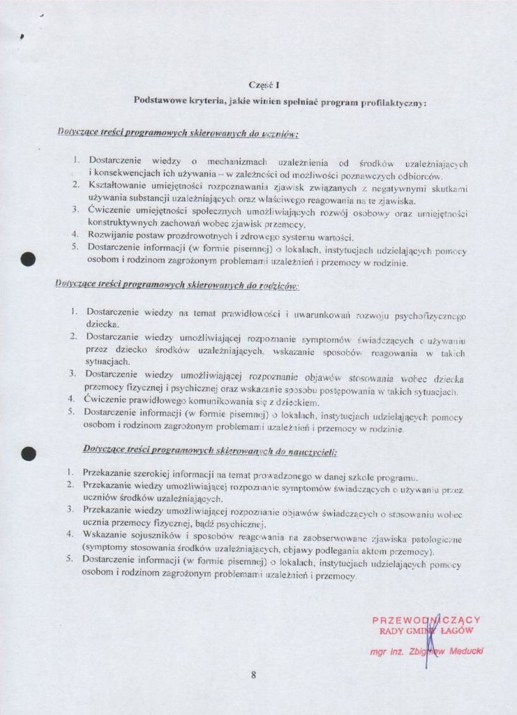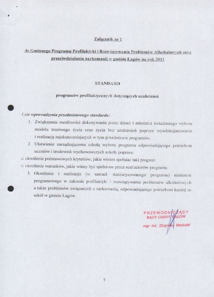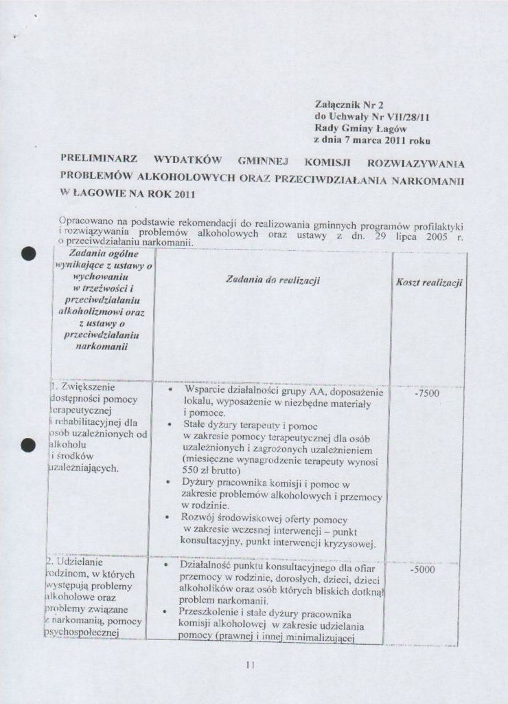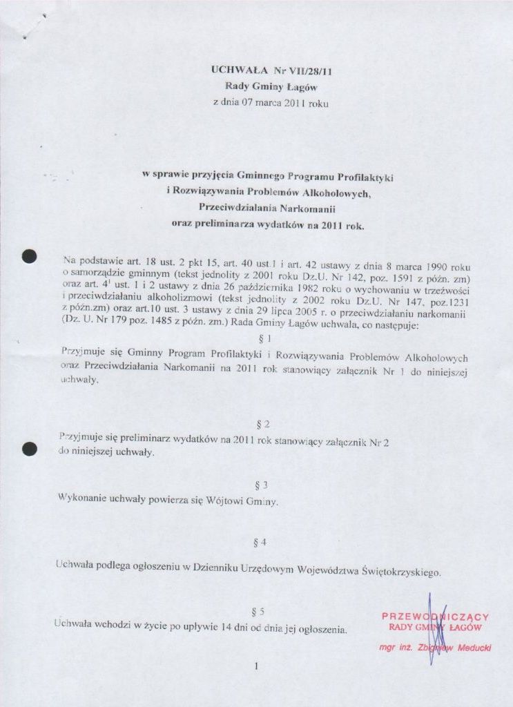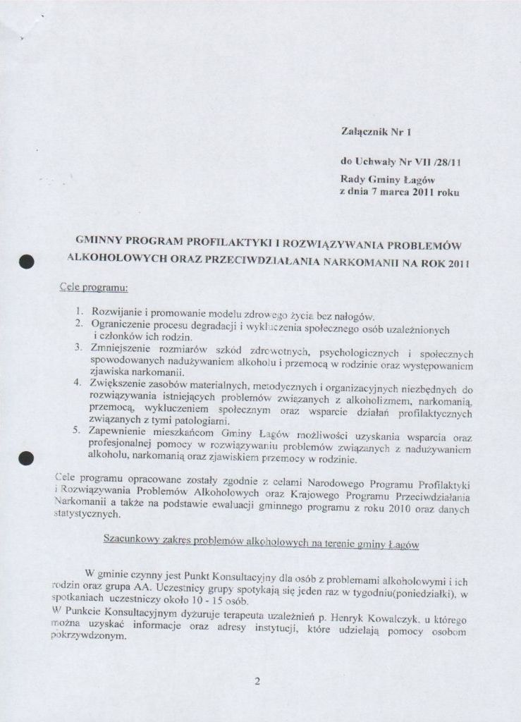 | Uchwała Nr VII/28/11 Rady Gminy Łagów z dnia 07 marca 2011 r. w sprawie przyjęcia Gminnego Programu Profilaktyki i Rozwiązywania Problemów Alkoholowych, Przeciwdziałania Narkomanii oraz preliminarza wydatków na 2011 rok | 2011-03-16 |