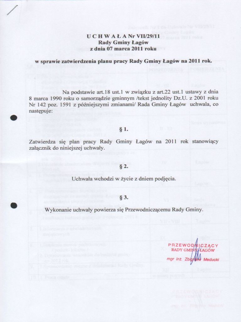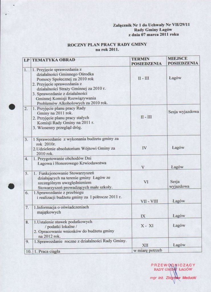 | Uchwała Nr VII/29/11 Rady Gminy Łagów z dnia 07 marca 2011 roku w sprawie zatwierdzenia planu pracy Rady Gminy na 2011 rok | 2011-03-22 |