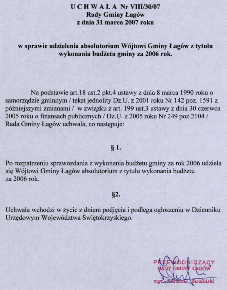 | Uchwała nr VIII/30/07 Rady Gminy Łagów z dnia 31 marca 2007 r. w sprawie udzielenia absolutorium Wójtowi Gminy Łagów z tytułu wykonania budżetu gminy za 2006 r. | 2008-08-25 |
