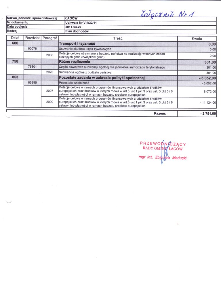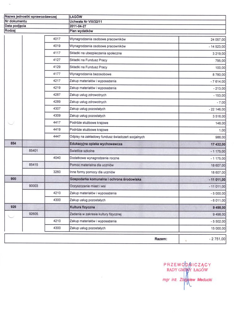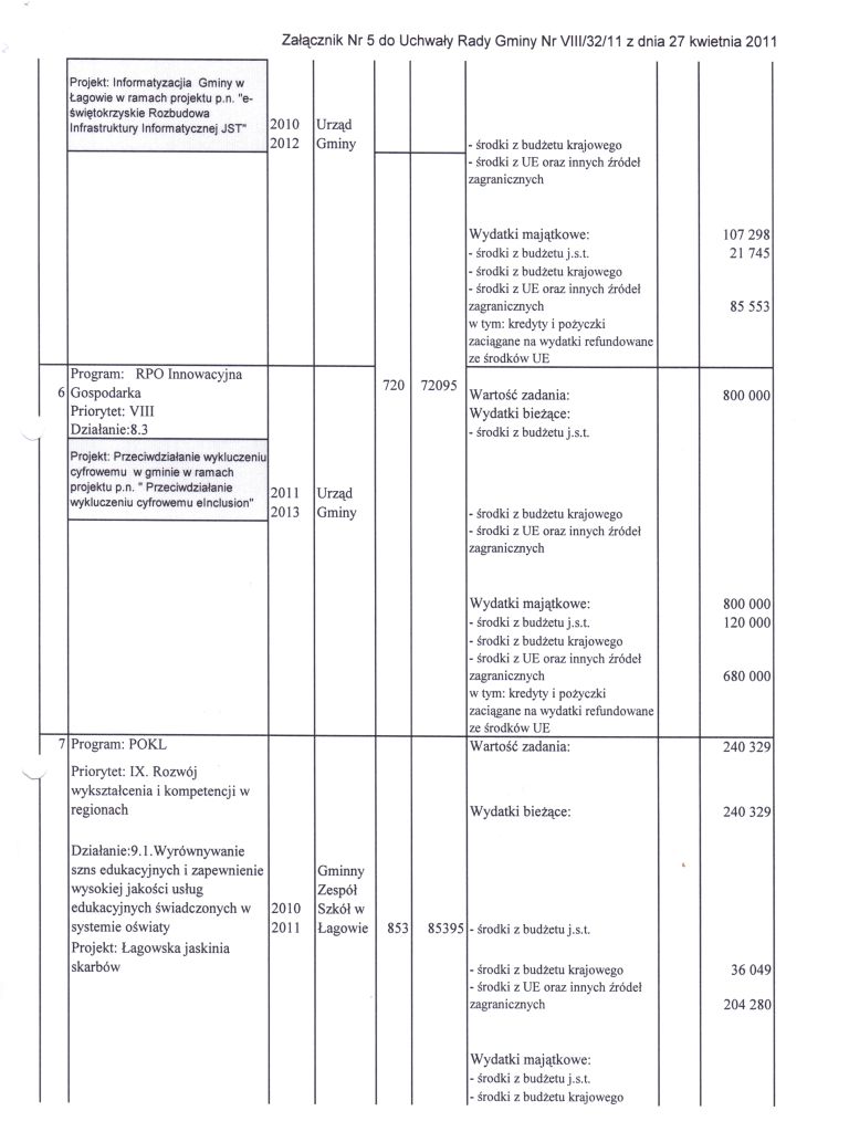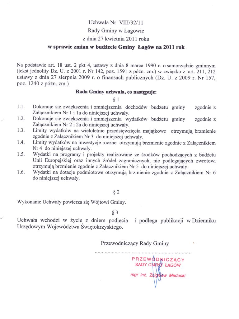 | Uchwała Nr VIII/32/11 Rady Gminy w Łagowie z dnia 27 kwoetnia 2011 r. w sprawie zmian w budżecie Gminy Łagów na 2011 rok | 2011-05-20 |
