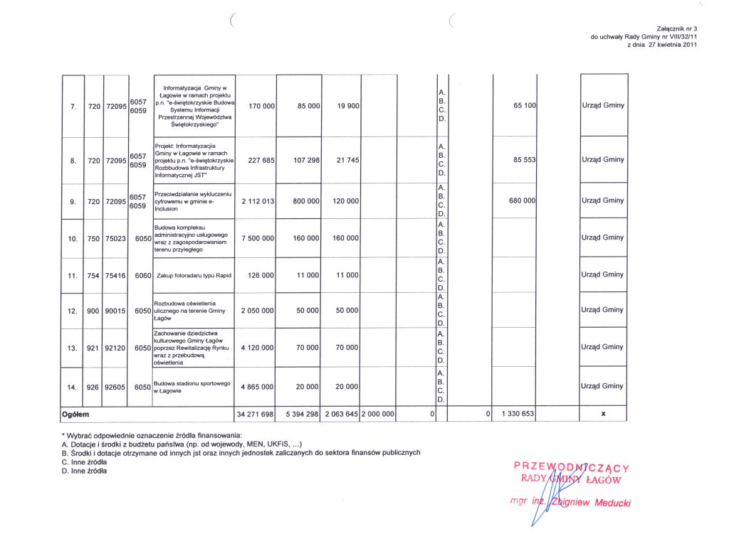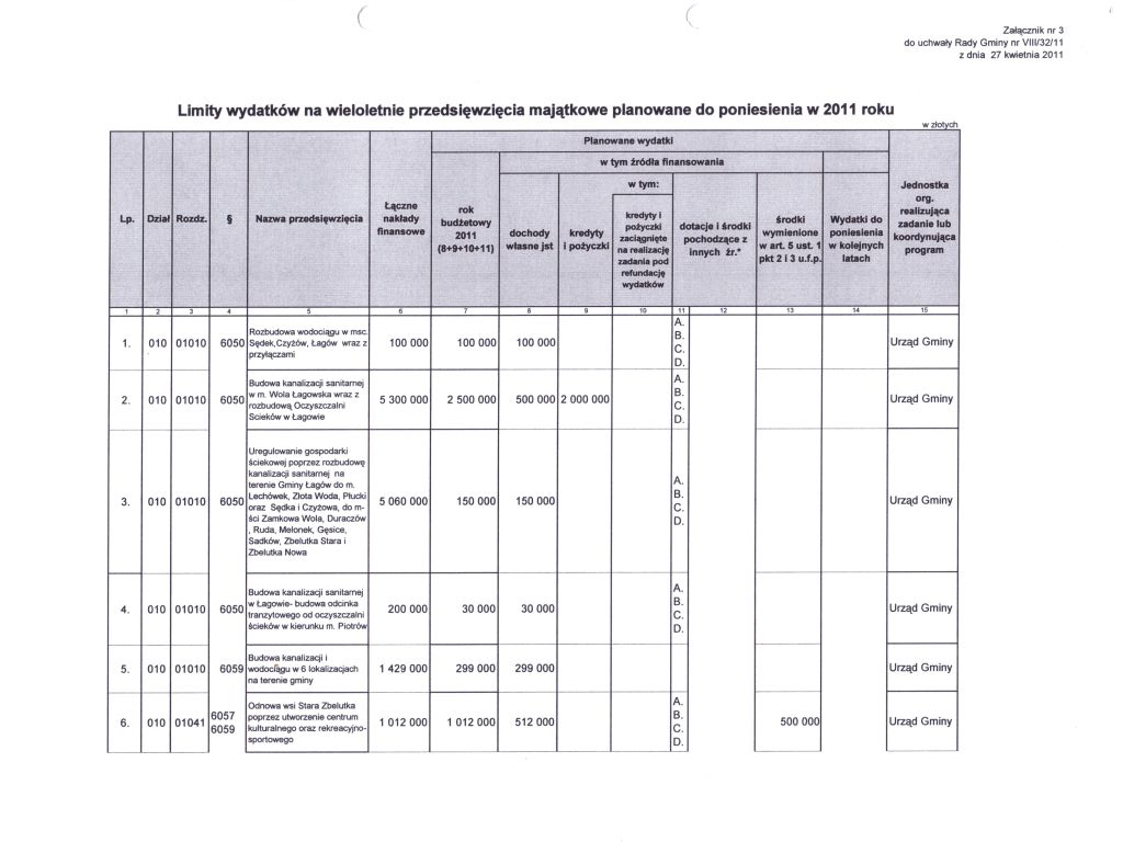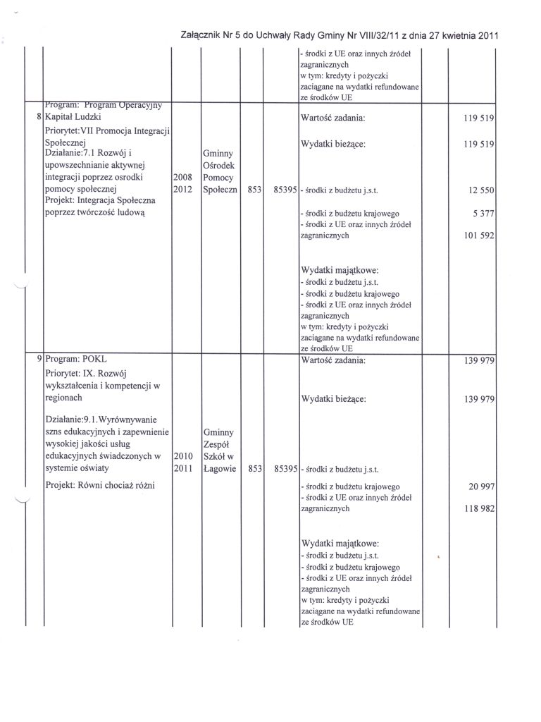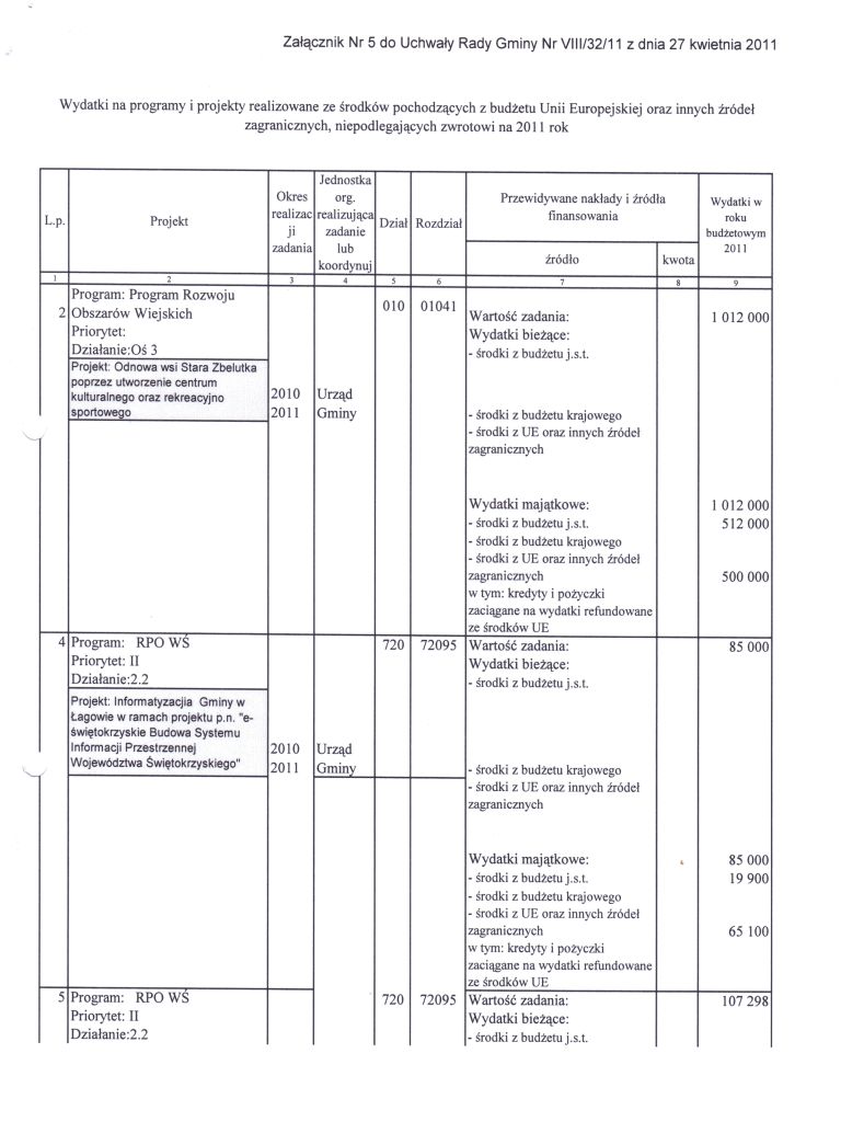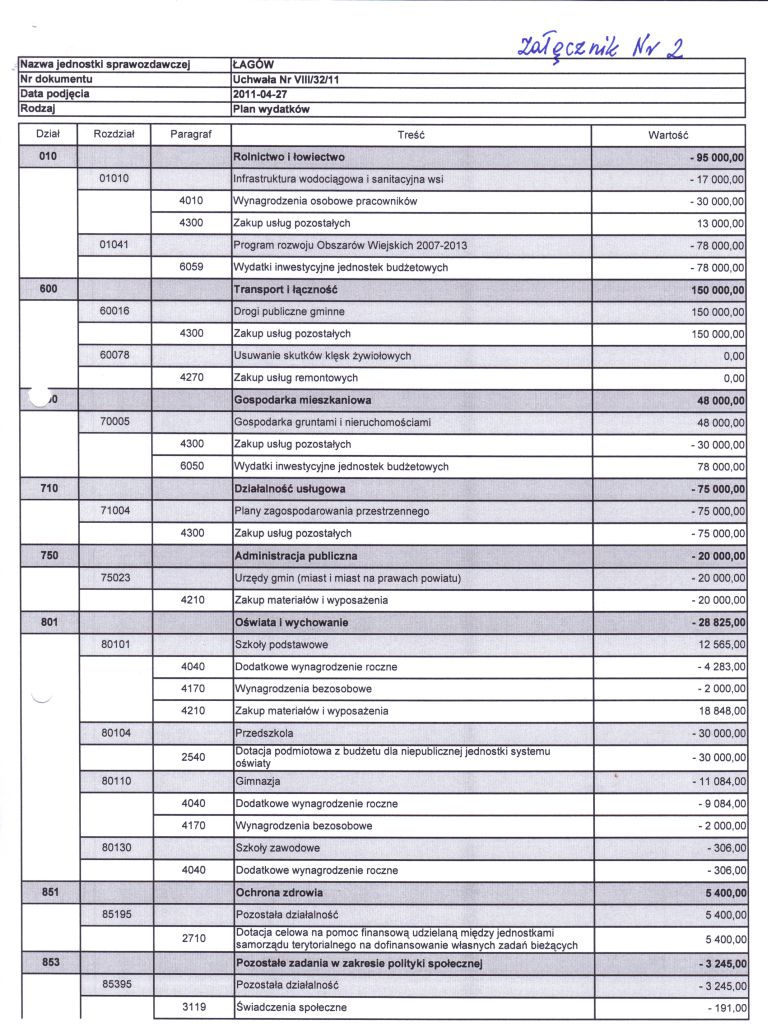 | Uchwała Nr VIII/32/11 Rady Gminy w Łagowie z dnia 27 kwoetnia 2011 r. w sprawie zmian w budżecie Gminy Łagów na 2011 rok | 2011-05-20 |
