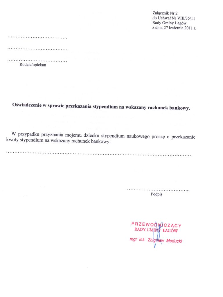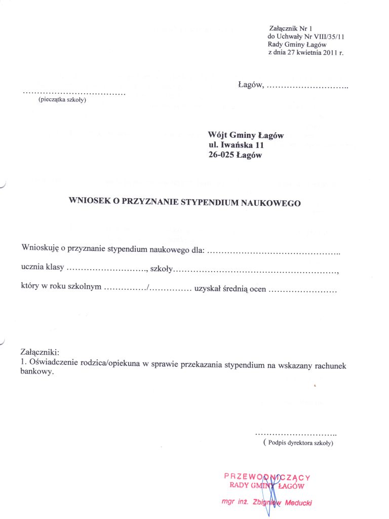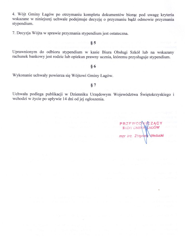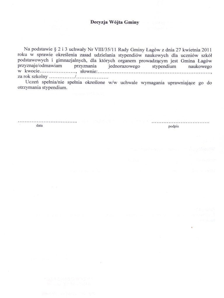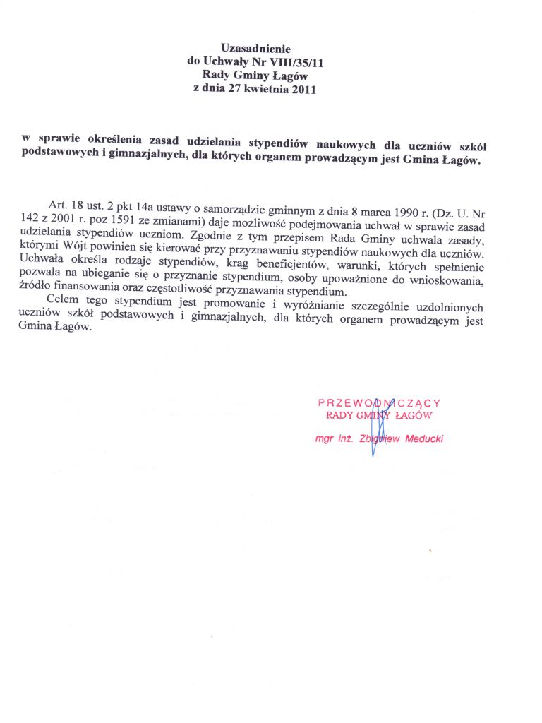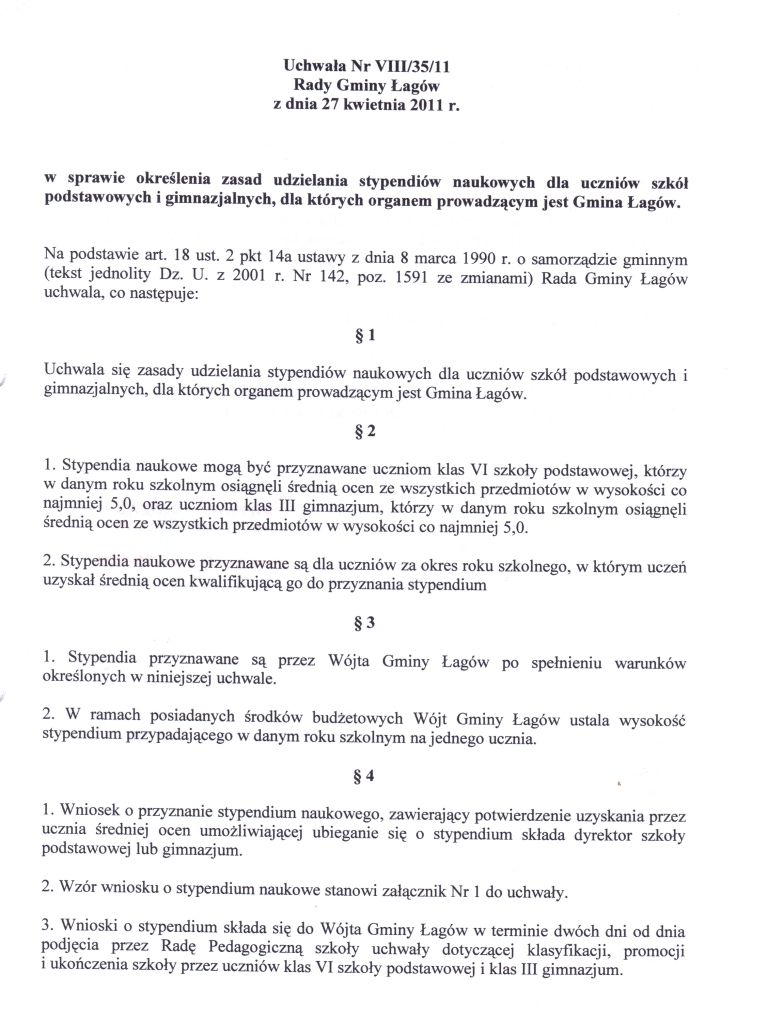 | Uchwała Nr VIII/35/11 Rady Gminy Łagów z dnia 27 kwietnia 2011 r. w sprawie określenia zasad udzielania stypendiów naukowych dla uczniów szkół podstawowych i gimnazjalnych, dla których organem prowadzącym jest Gmina Łagów | 2011-05-20 |