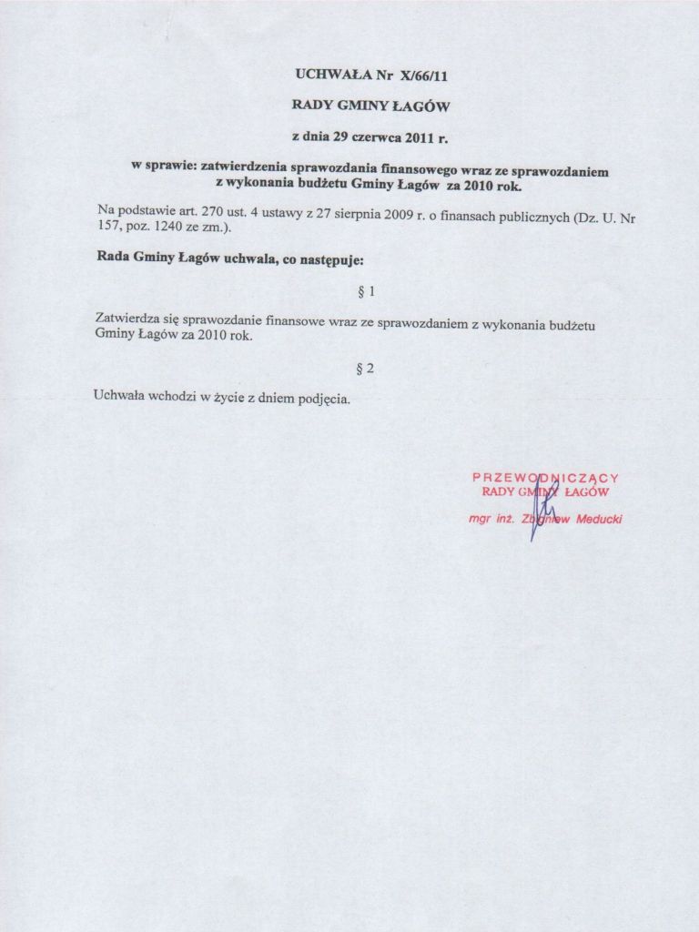 | Uchwała Nr X/66/11 Rady Gminy Łagów z dnia 29 czerwca 2011 r. w sprawie: zatwierdzenia sprawozdania finansowego wraz ze sprawozdaniem z wykonania budżetu Gminy Łagów na 2010 rok | 2011-07-06 |