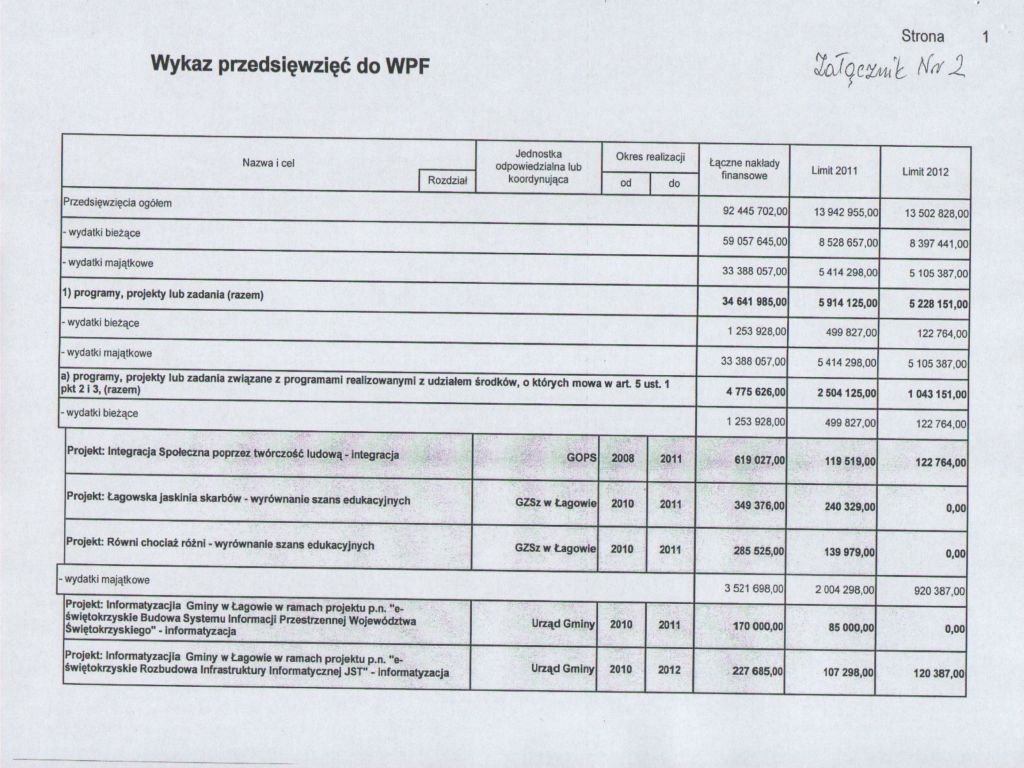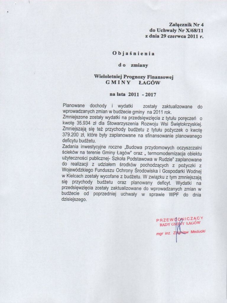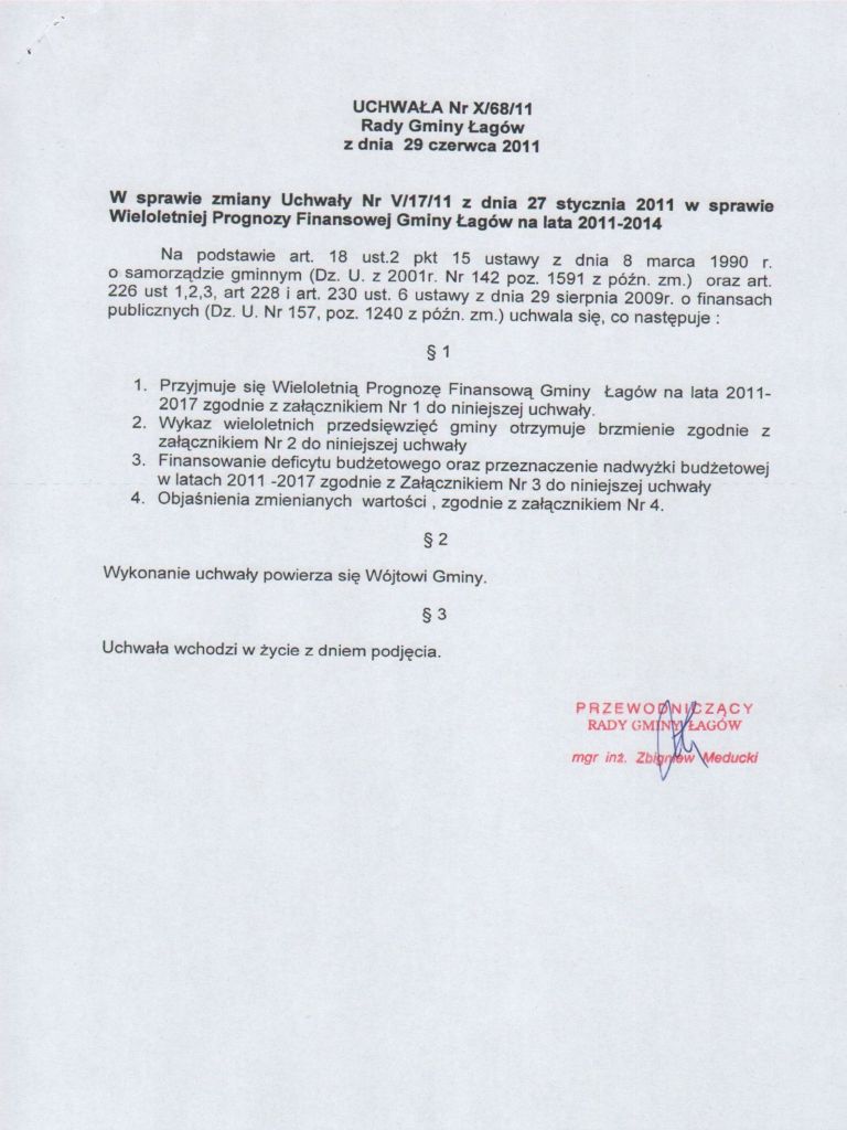 | Uchwała Nr X/68/11 Rady Gminy Łagów z dnia 29 czerwca 2011 r. w sprawie zmiany Uchwały Nr V/17/11 z dnia 27 stycznia 2011 w sprawie Wieloletniej Prognozy Finansowej Gminy Łagów na lata 2011-2014 | 2011-07-06 |