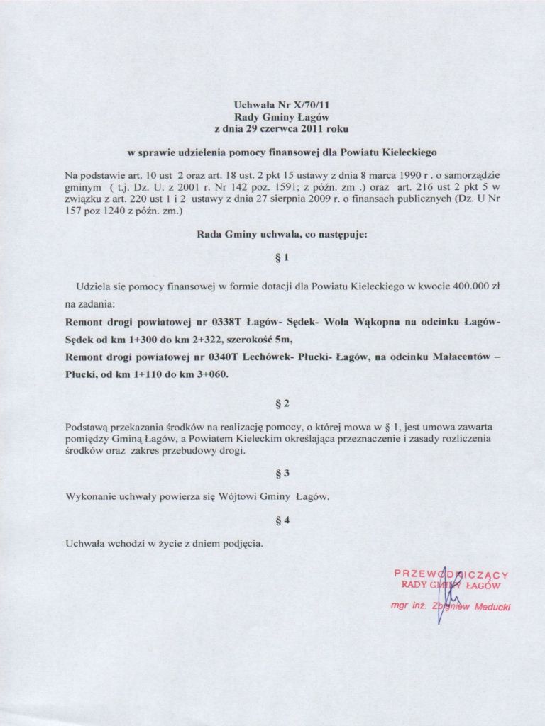 | Uchwała Nr X/70/11 Rady Gminy Łagów z dnia 29 czerwca 2011 roku w sprawie udzielenia pomocy finansowej dla Powiatu Kieleckiego | 2011-07-06 |