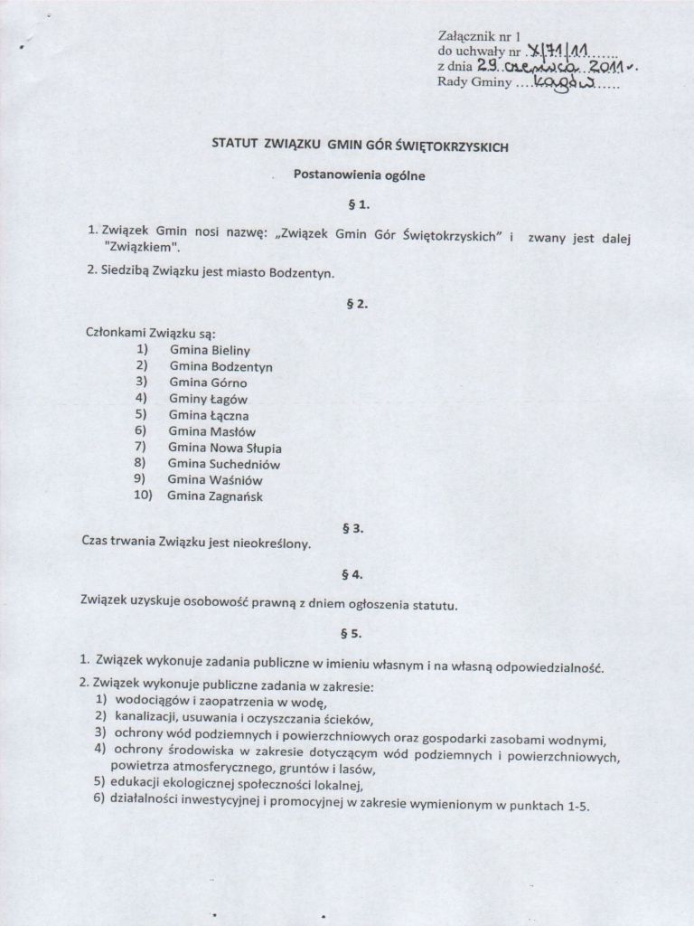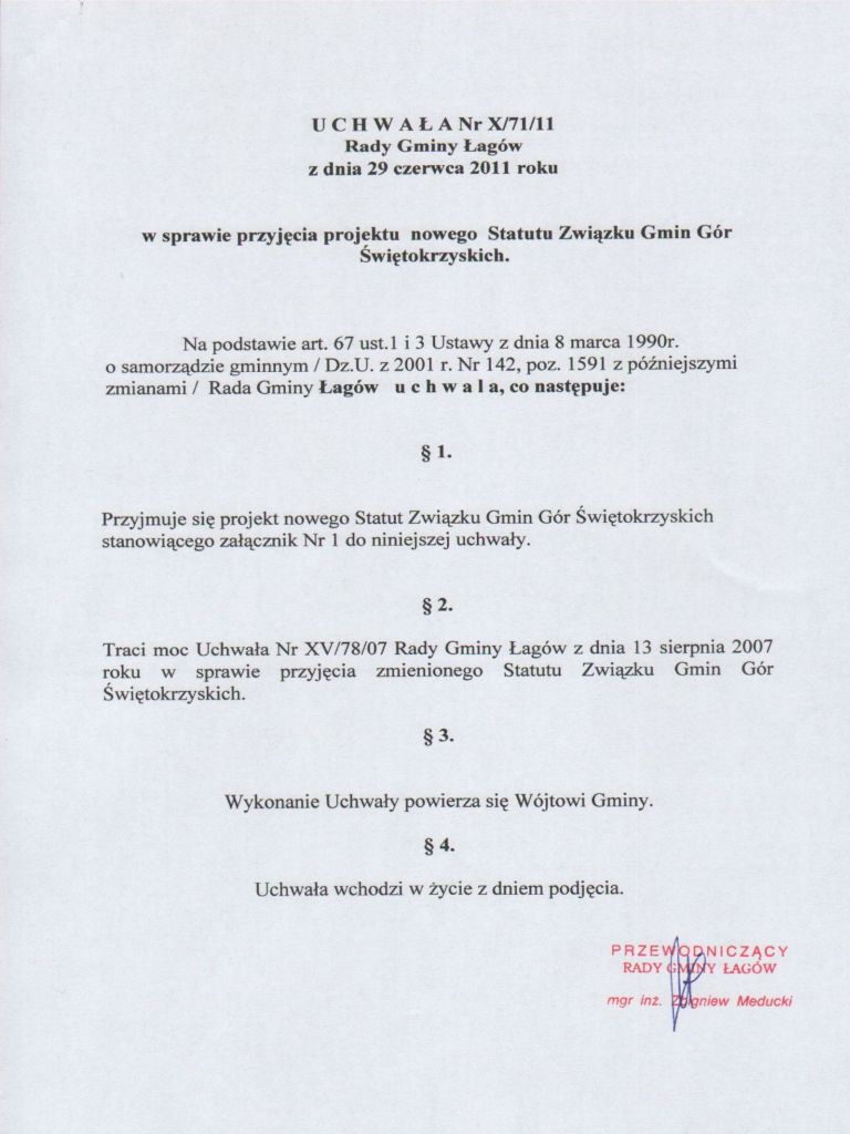| Uchwała Nr X/71/11 Rady Gminy Łagów z dnia 29 czerwca 2011 roku w sprawie przyjęcia projektu nowego Statutu Związku Gmin Gór Świętokrzyskich | 2011-07-06 |