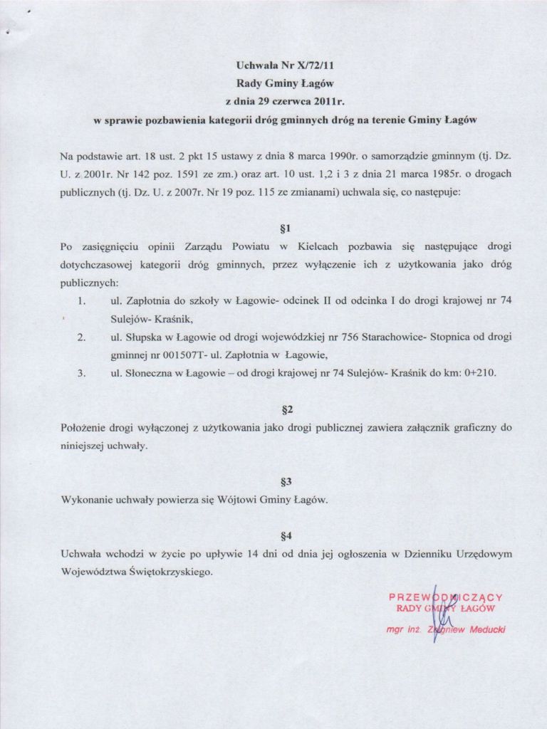 | Uchwała Nr X/72/11 Rady Gminy Łagów z dnia 29 czerwca 2011 r. w sprawie pozbawienia kategorii dróg gminnych na terenie Gminy Łagów | 2011-07-06 |
