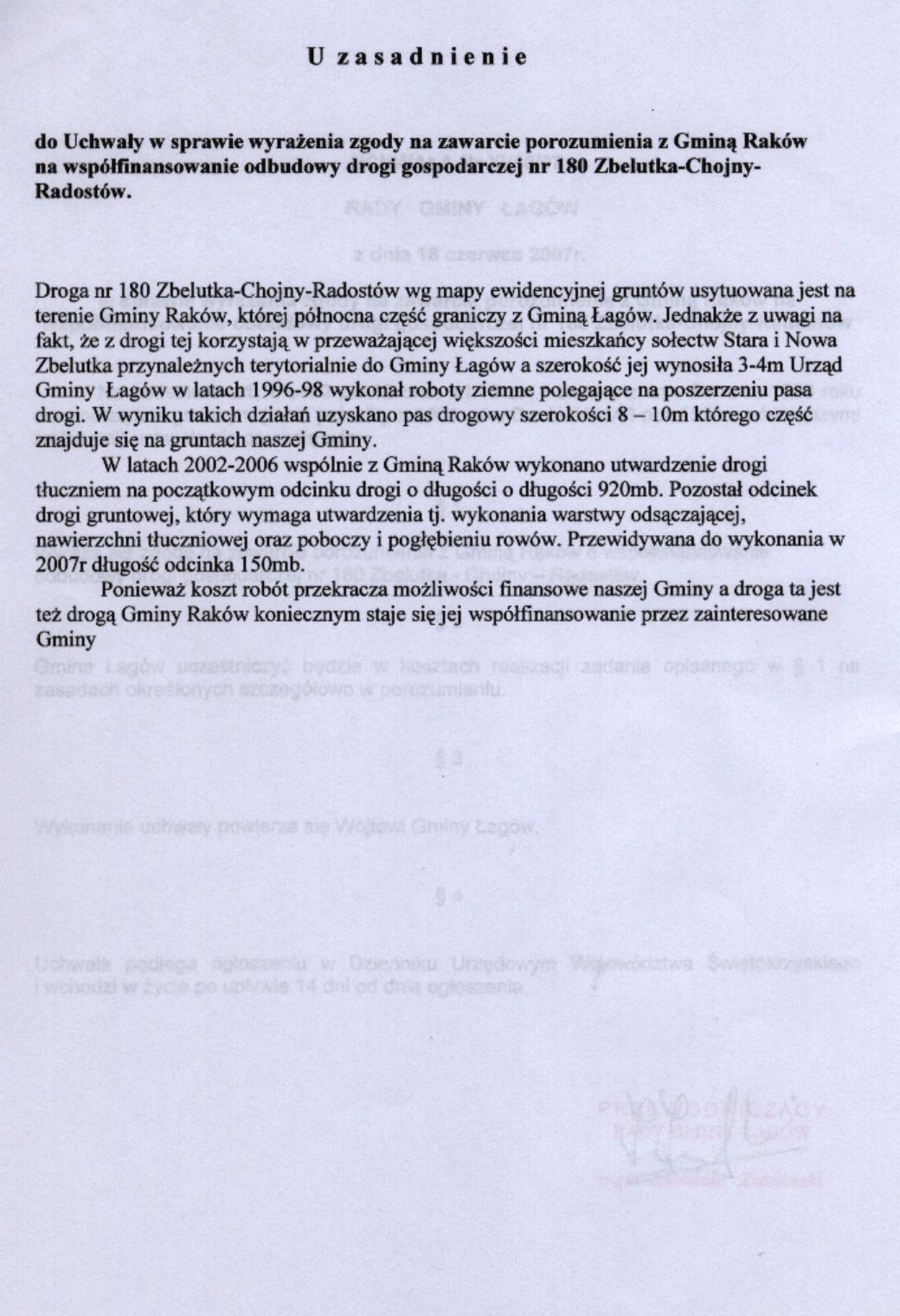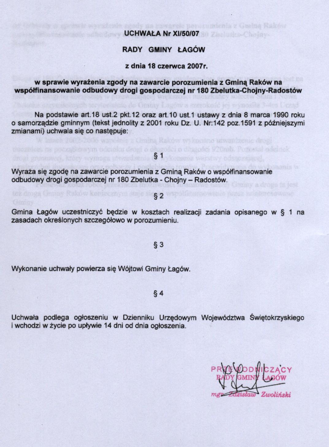 | Uchwała nr XI/50/07 Rady Gminy Łagów z dnia 18 czerwca 2007 r. w sprawie wyrażenia zgody na zawarcie porozumienia z Gminą Raków na współfinansowanie odbudowy drogi gospodarczej nr 180 Zelutka-Chojny-Radostów | 2008-08-26 |