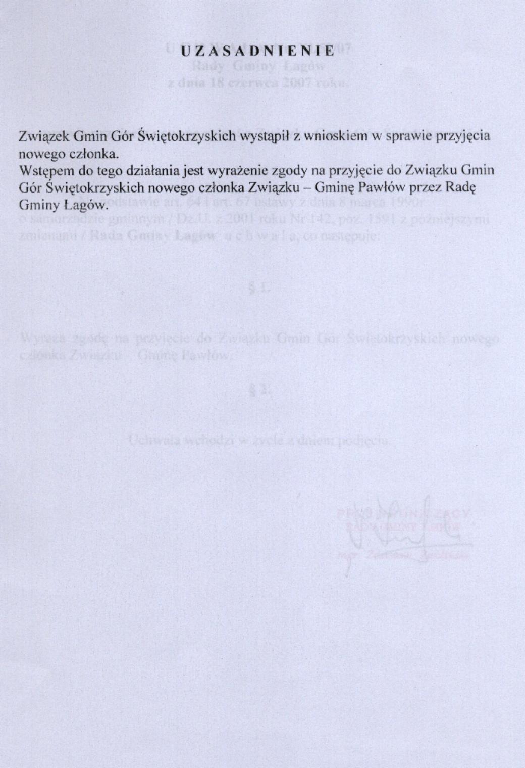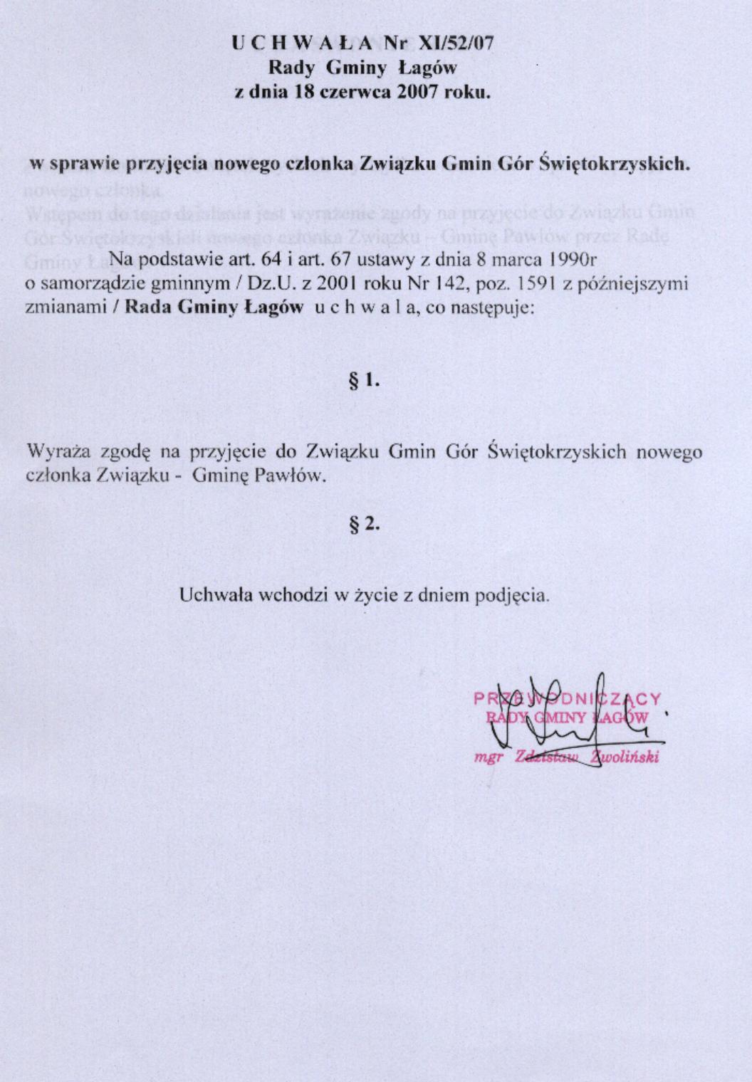 | Uchwała nr XI/52/07 Rady Gminy Łagów z dnia 18 czerwca 2007 r. w sprawie przyjęcia noweggo członka Związku Gmin Gór Świętokrzyskich | 2008-08-26 |