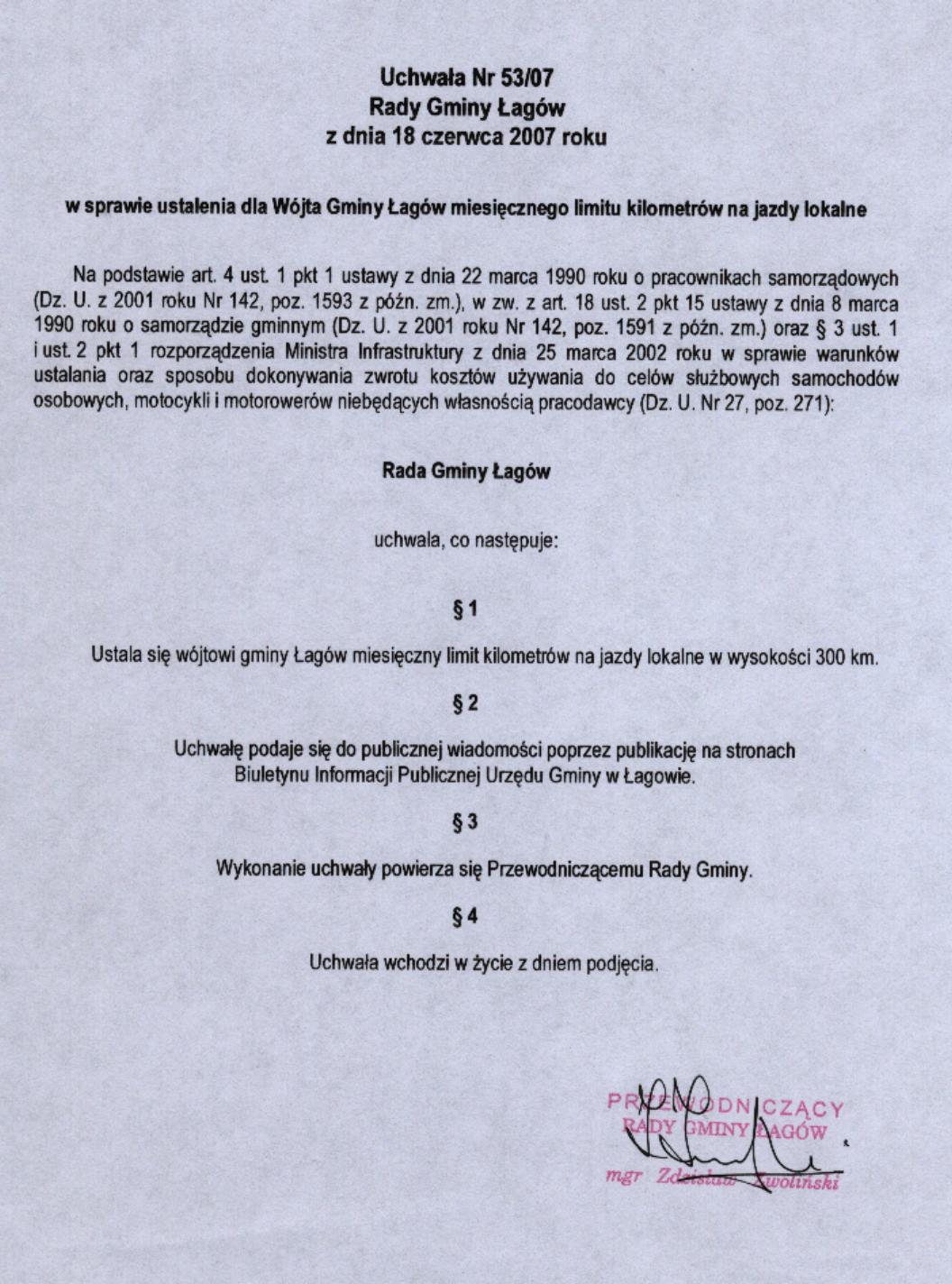 | Uchwała nr XI/53/07 Rady Gminy Łagów z dnia 18 czerwca 2007 r. w sprawie ustalenia dla Wójta Gminy Łagów miesięcznego limitu kilometrów na jazdy lokalne | 2008-08-26 |