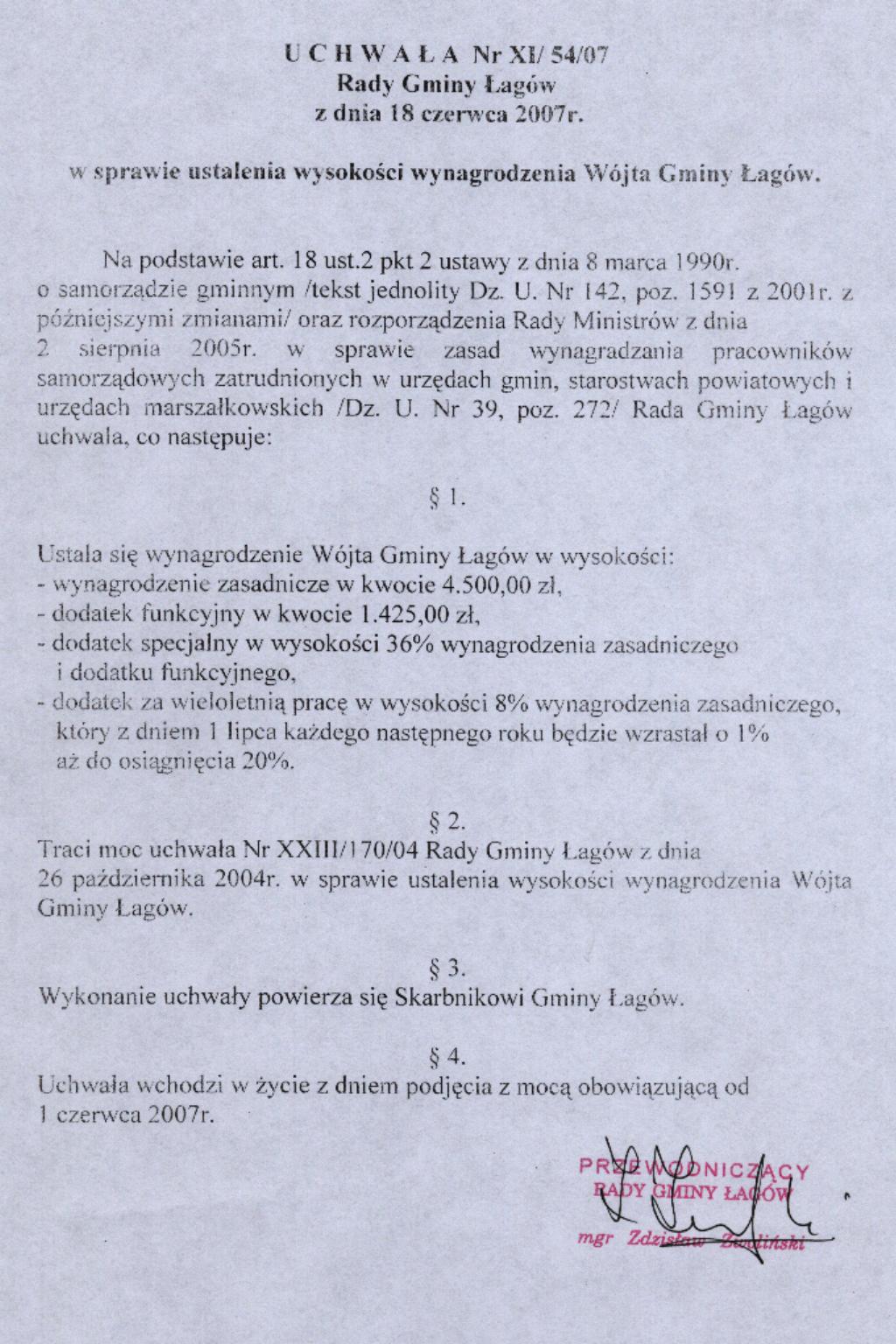 | Uchwała nr XI/54/07 Rady Gminy Łagów z dnia 18 czerwca 2007 r. w sprawie ustalenia wysokości wynagrodzenia Wójta Gminy Łagów | 2008-08-26 |
