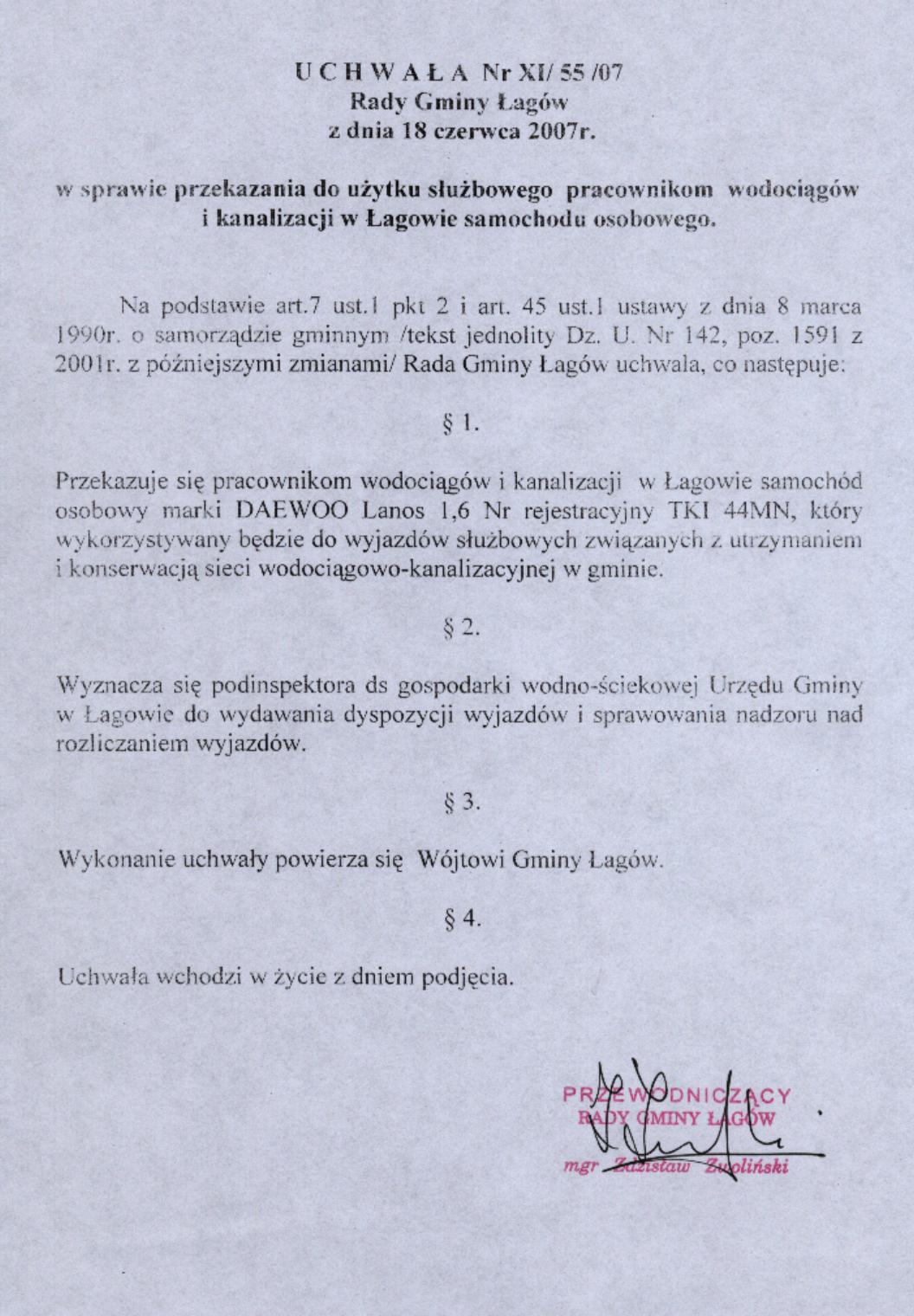 | Uchwała nr XI/55/07 Rady Gminy Łagów z dnia 18 czerwca 2007 r. w sprawie przekazania do użytku służbowego pracownikom wodociągów i kanalizacji w Łagowie samochodu osobowego | 2008-08-26 |