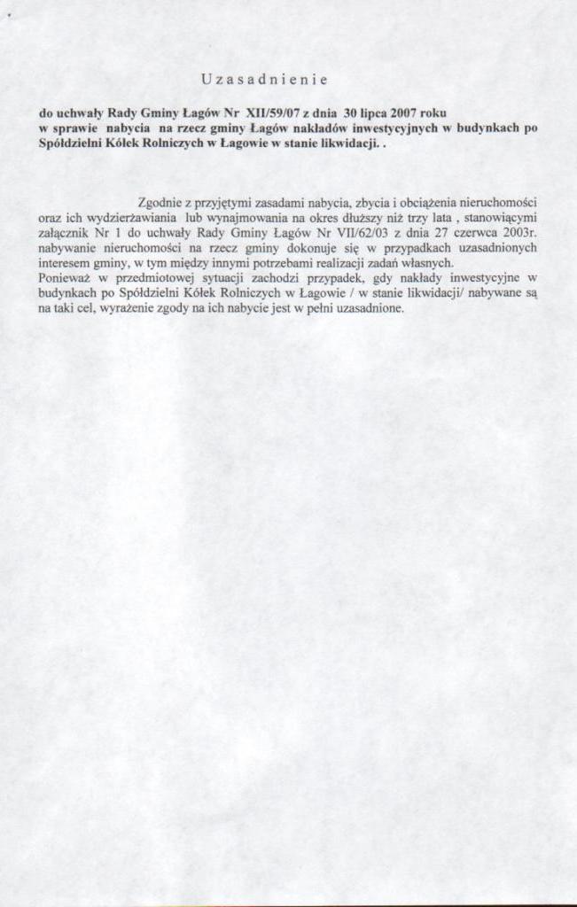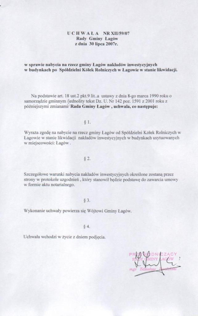 | Uchwała nr XII/59/07 Rady Gminy Łagów z dnia 30 lipca 2007 r. w sprawie nabycia na rzecz Gminy Łagów nakładów inwestycyjnych w budynkach po Spółdzielni Kółek rolniczych w Łagowie w stanie likwidacji | 2008-08-26 |