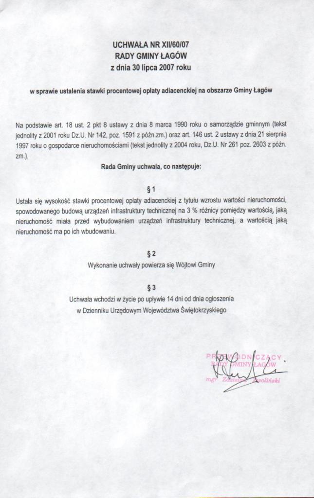 | Uchwała nr XII/60/07 Rady Gminy Łagów z dnia 30 lipca 2007 r. w sprawie ustalenia stawki procentowej opłaty adjacenckiej na obszarze Gminy Łagów | 2008-08-26 |