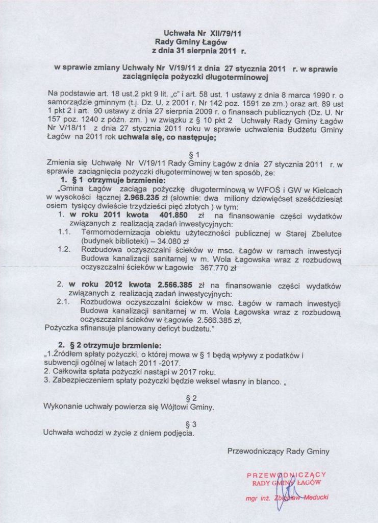 | Uchwała Nr XII/79/11 Rady Gminy Łagów z dnia 31 sierpnia 2011 r. w sprawie zmiany Uchwały Nr V/19/11 z dnia 27 stycznia 2011 r. w sprawie zaciągnięcia pożyczki długoterminowej | 2011-09-07 |