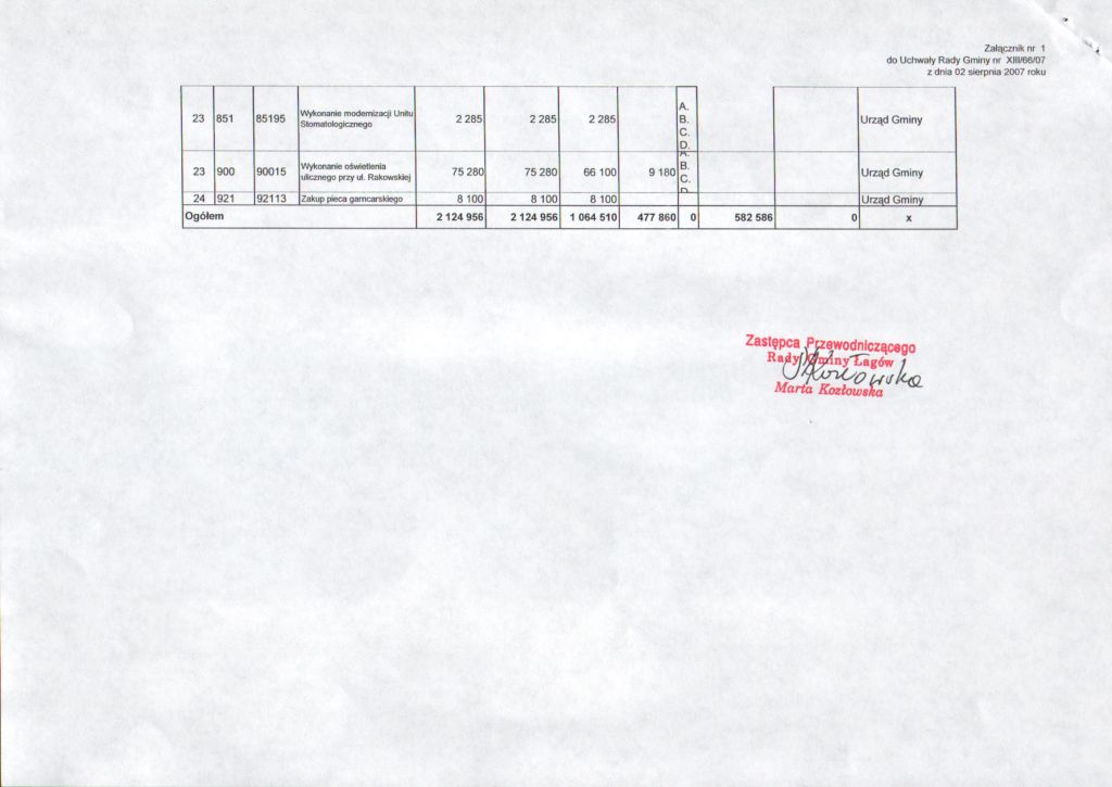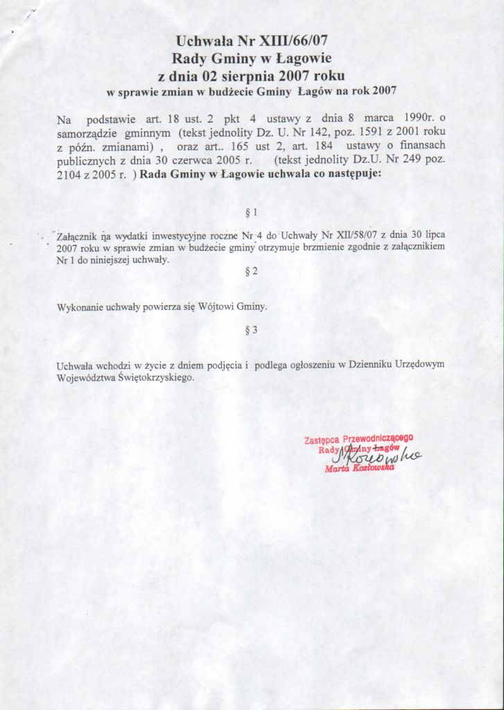 | Uchwała nr XIII/66/07 Rady Gminy Łagów z dnia 2 sierpnia 2007 r. w sprawie zmian w budżecie gminy Łagów na rok 2007 | 2008-08-26 |