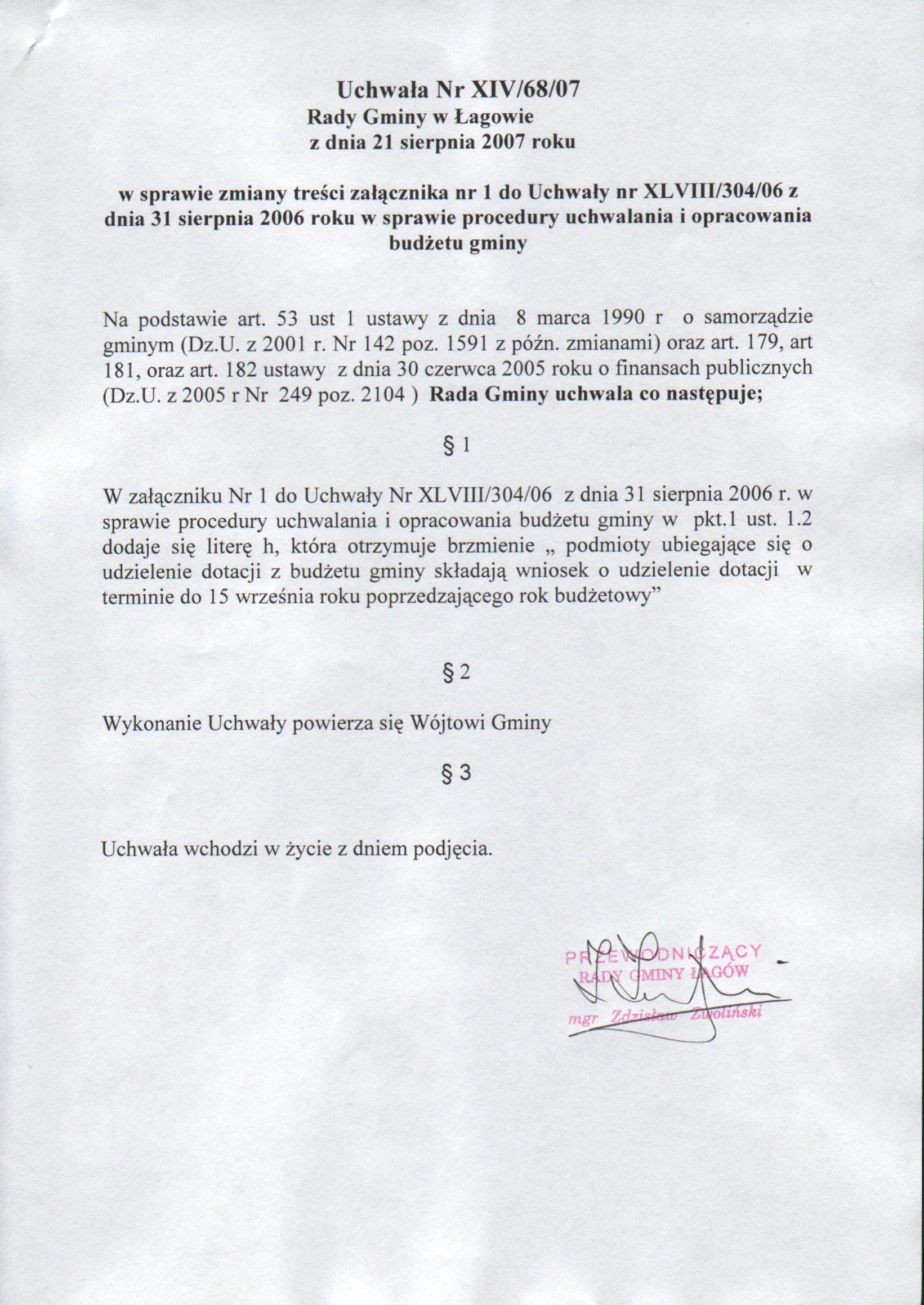 | Uchwała nr XIV/68/07 Rady Gminy Łagów z dnia 21 sierpnia 2007 r. w sprawie zmiany treści załacznika nr 1 do Uchwały nr XLVIII/304/06 z 31 sierpnia 2006 r w sprawie procedury uchwalania i opracowania budżetu gminy | 2008-08-26 |