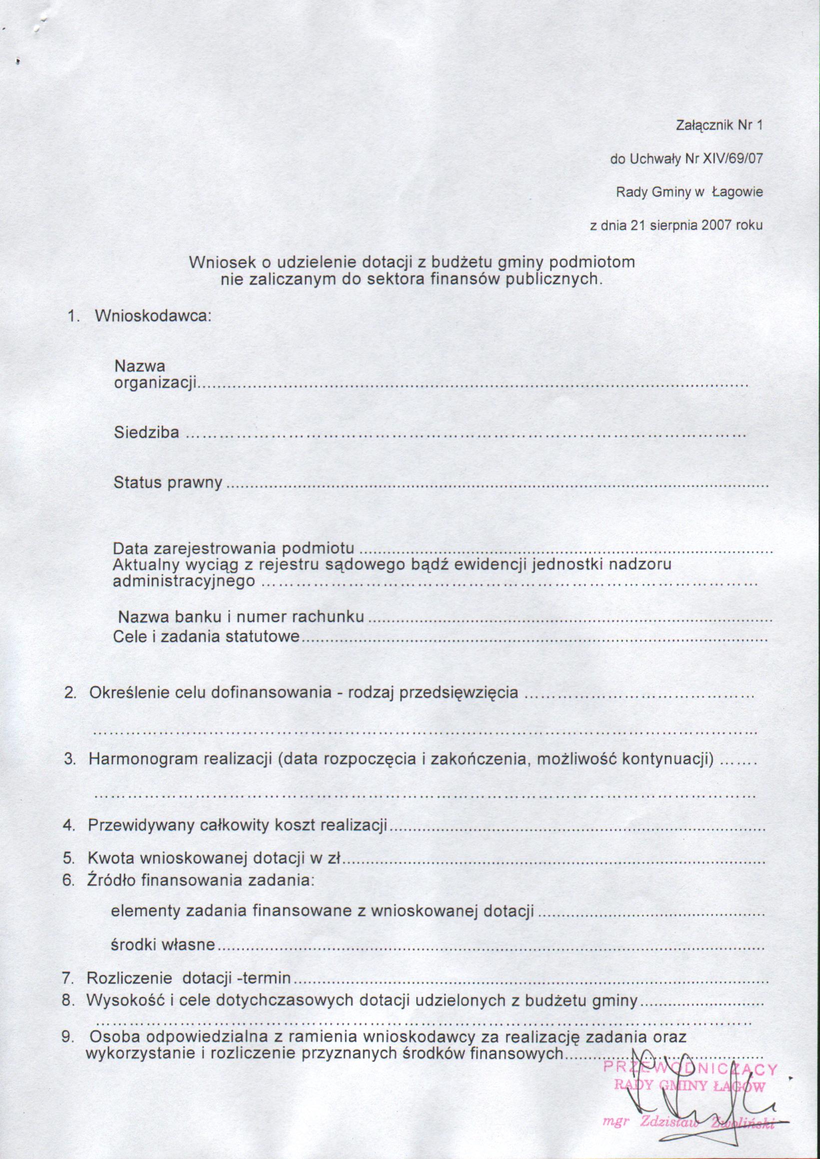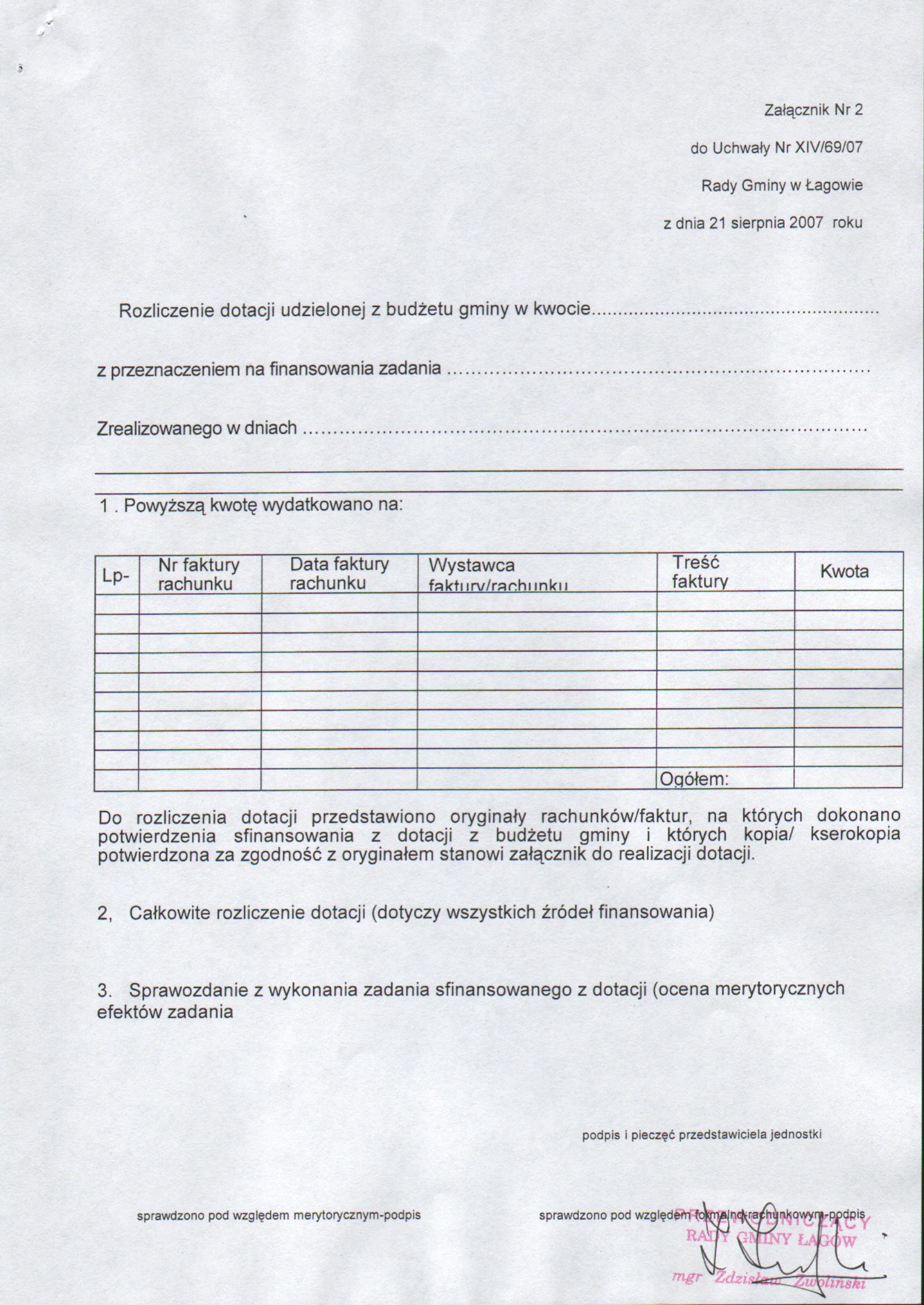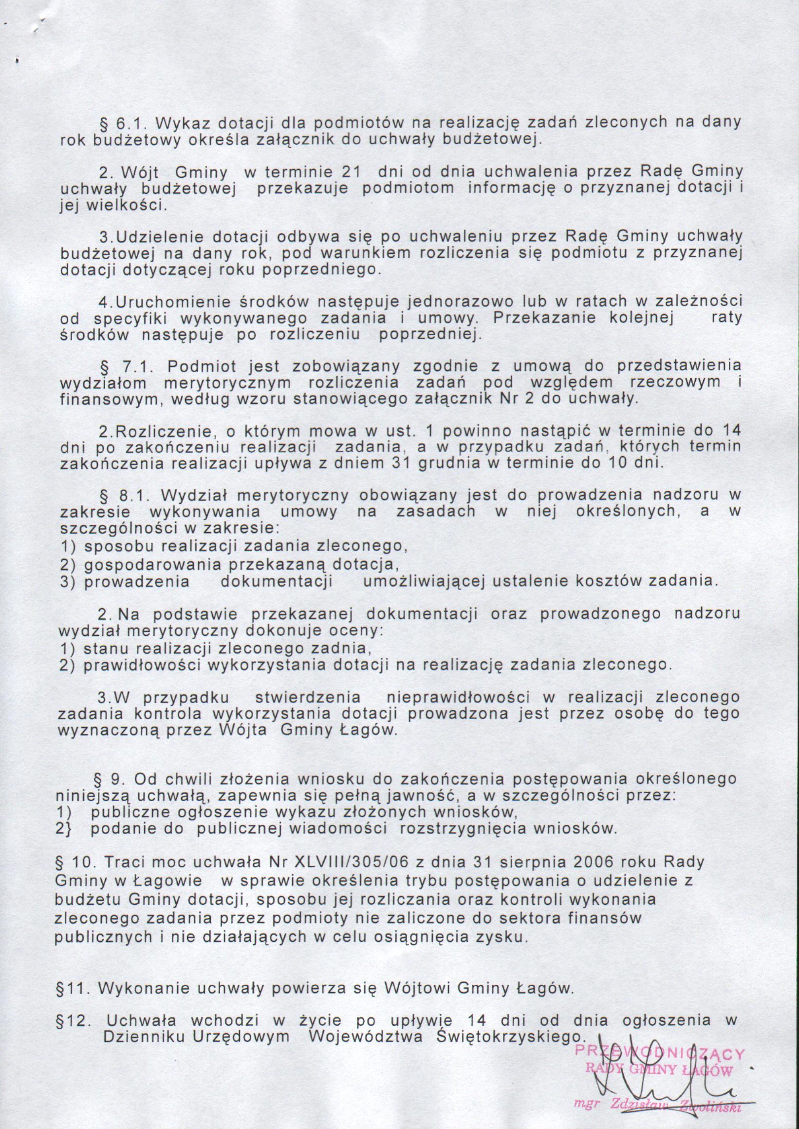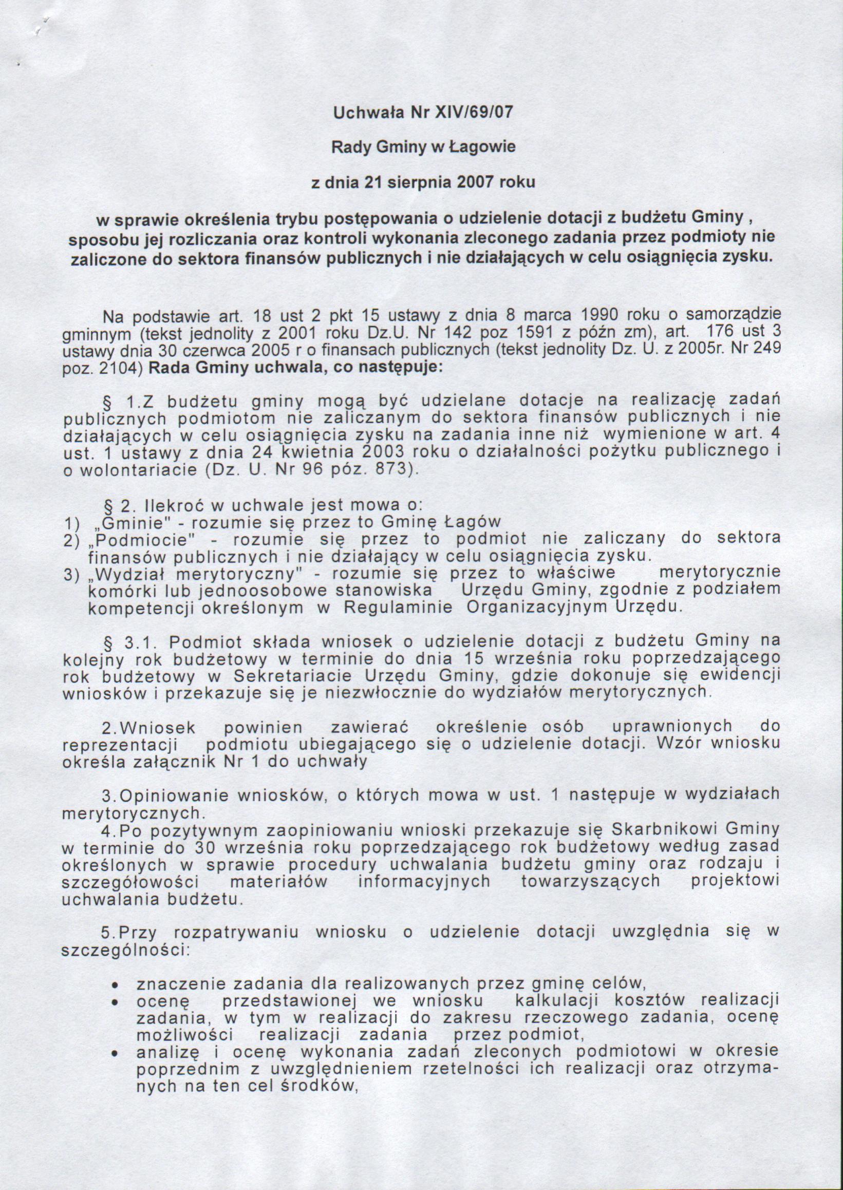 | Uchwała nr XIV/69/07 Rady Gminy Łagów z dnia 21 sierpnia 2007 r. w sprawie określenia trybu postępowania o udzielenie dotacji z budżetu gminy, sposobu jej rozliczania oraz kontroli wykonania zleconego zadania | 2008-08-26 |