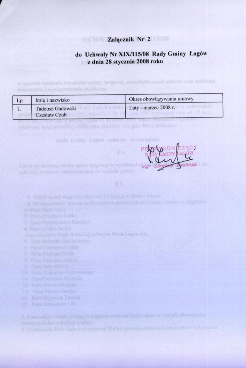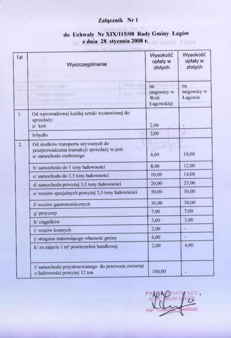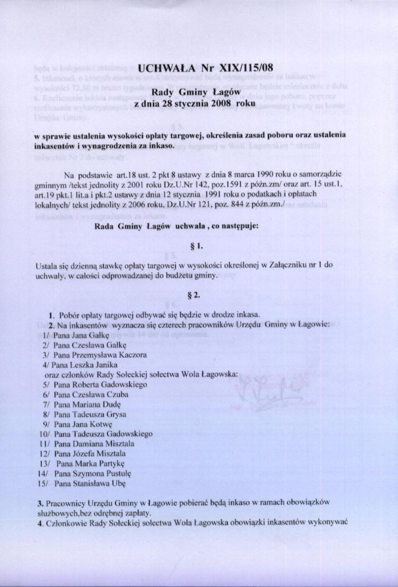 | Uchwała nr XIX/115/08 Rady Gminy Łagów z dnia 28 stycznia 2008 r. w sprawie ustalenia wysokości opłaty targowej, określenia zasad poboru oraz ustalenia inkasentów i wynagrodzenia za inkaso. | 2008-08-13 |
