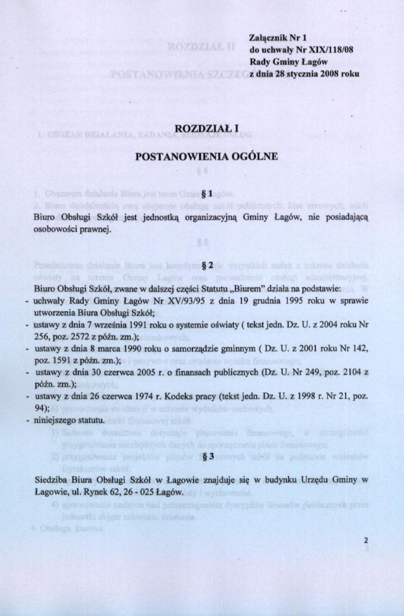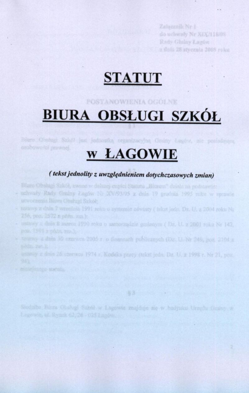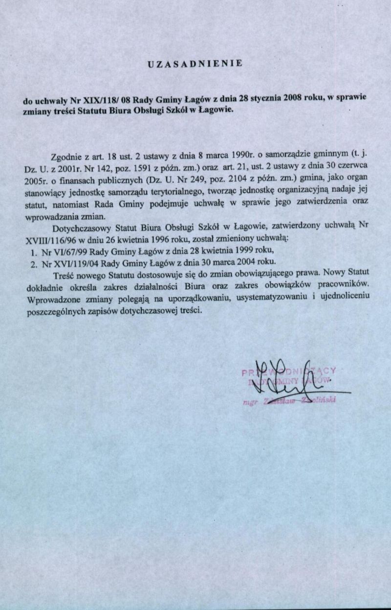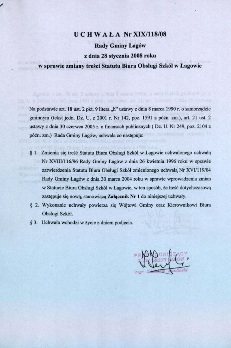 | Uchwała nr XIX/118/08 Rady Gminy Łagów z dnia 28 stycznia 2008 r. w sprawie zmiany treści statutu Biura Obsługi Szkół w Łagowie | 2008-08-13 |