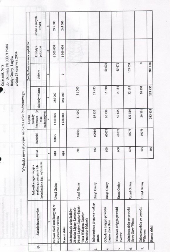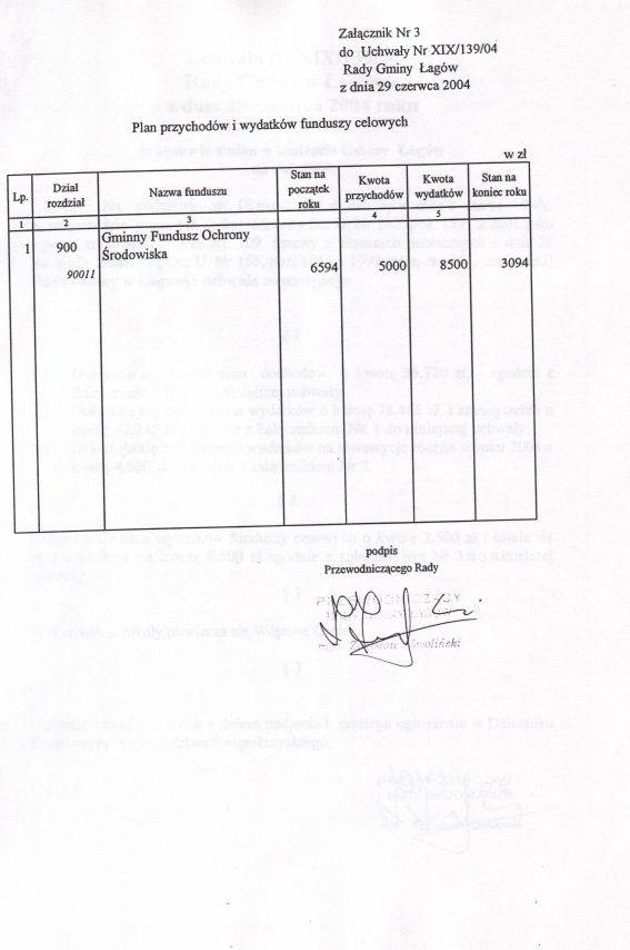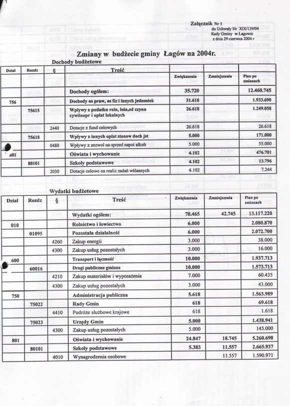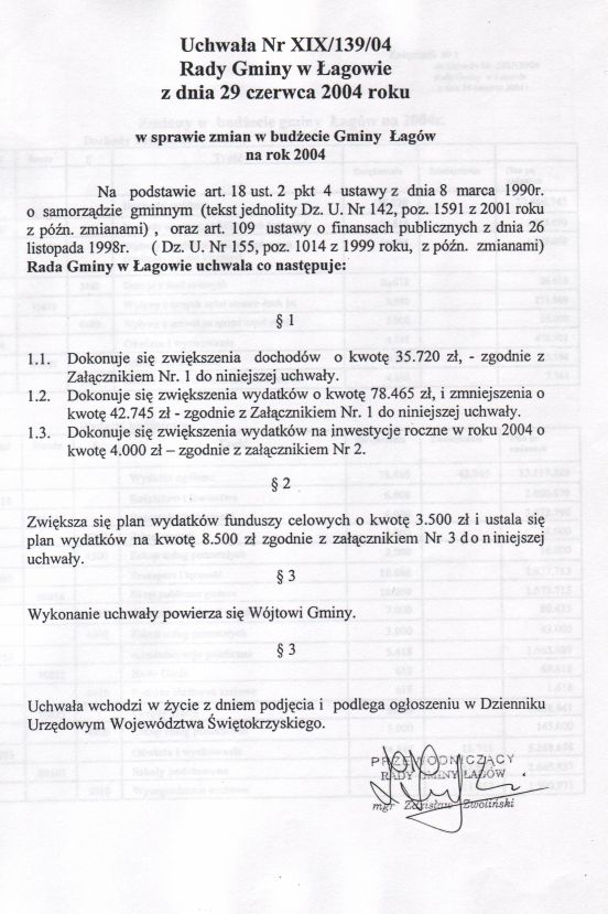 | Uchwała nr XIX/139/04 Rady Gminy w Łagowie z dn. 29 czerwca 2004 r. w sprawie zmian w budżecie Gminy Łagów na rok 2004. | 2008-10-22 |
