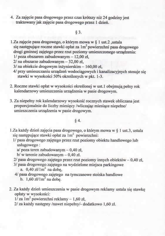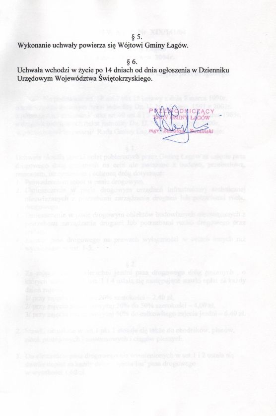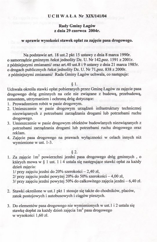 | Uchwała nr XIX/141/04 Rady Gminy w Łagowie z dn. 29 czerwca 2004 r. w sprawie wysokości stawek opłat za zajęcie pasa drogowego. | 2008-10-22 |