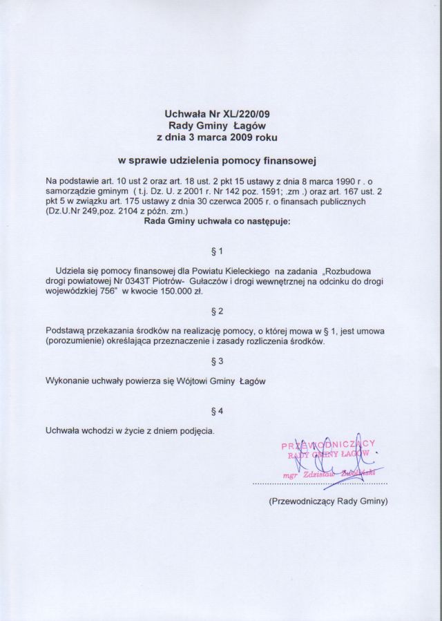 | Uchwała Nr XL/220/09 Rady Gminy w Łagowie z dn. 3 marca 2009 r. w sprawie udzielenia pomocy finansowej. | 2009-03-12 |