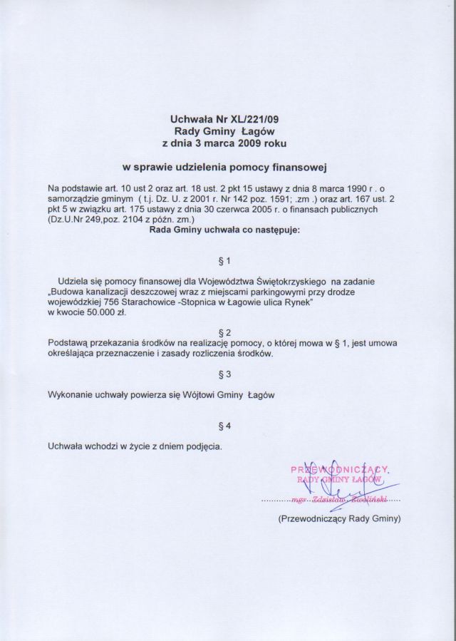 | Uchwała Nr XL/221/09 Rady Gminy w Łagowie z dn. 3 marca 2009 r. w sprawie udzielenia pomocy finansowej. | 2009-03-12 |