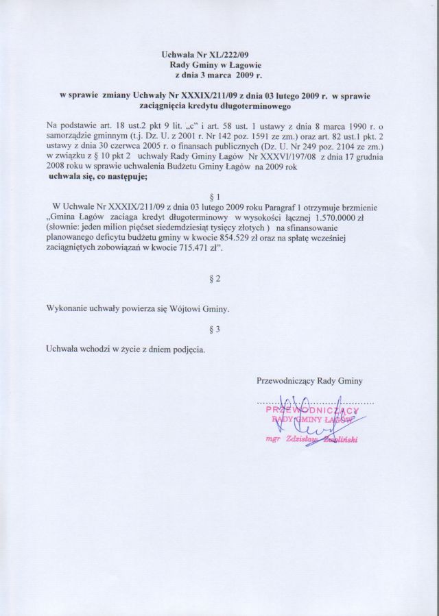 | Uchwała Nr XL/222/09 Rady Gminy w Łagowie z dn. 3 marca 2009 r. w sprawie zmiany Uchwały Nr XXXIX/211/09 z dnia 03 lutego 2009 r. w sprawie zaciągnięcia kredytu długoterminowego. | 2009-03-12 |