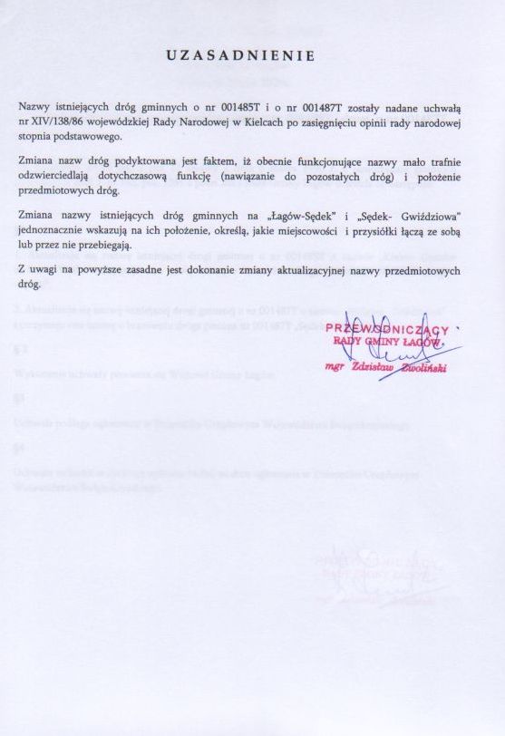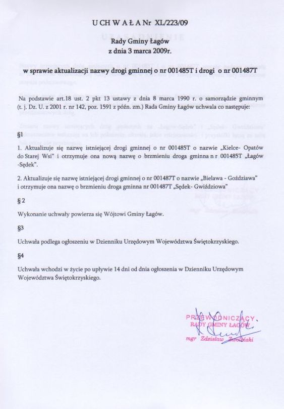 | Uchwała Nr XL/223/09 Rady Gminy w Łagowie z dn. 3 marca 2009 r. w sprawie aktualizacji nazwy drogi gminnej o nr 001485T i drogi o nr 001487T. | 2009-03-12 |
