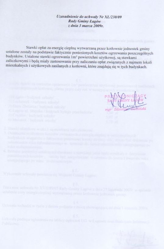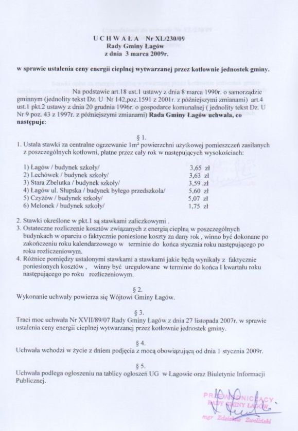 | Uchwała Nr XL/230/09 Rady Gminy w Łagowie z dn. 3 marca 2009 r. w sprawie ustalenia energii cieplnej wytwarzanej przez kotłownie jednostek gminy. | 2009-03-12 |