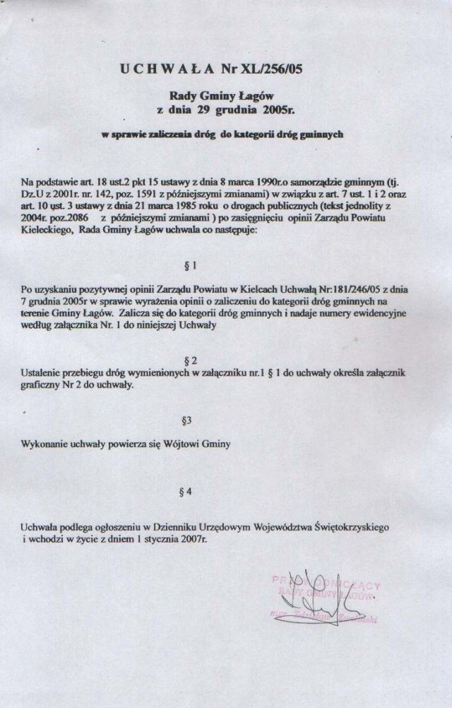 | Uchwała nr XL/256/05 Rady Gminy w Łagowie z dn. 29 grudnia 2005 r. w sprawie zaliczewnia dróg do kategorii dróg gminnych. | 2008-10-22 |