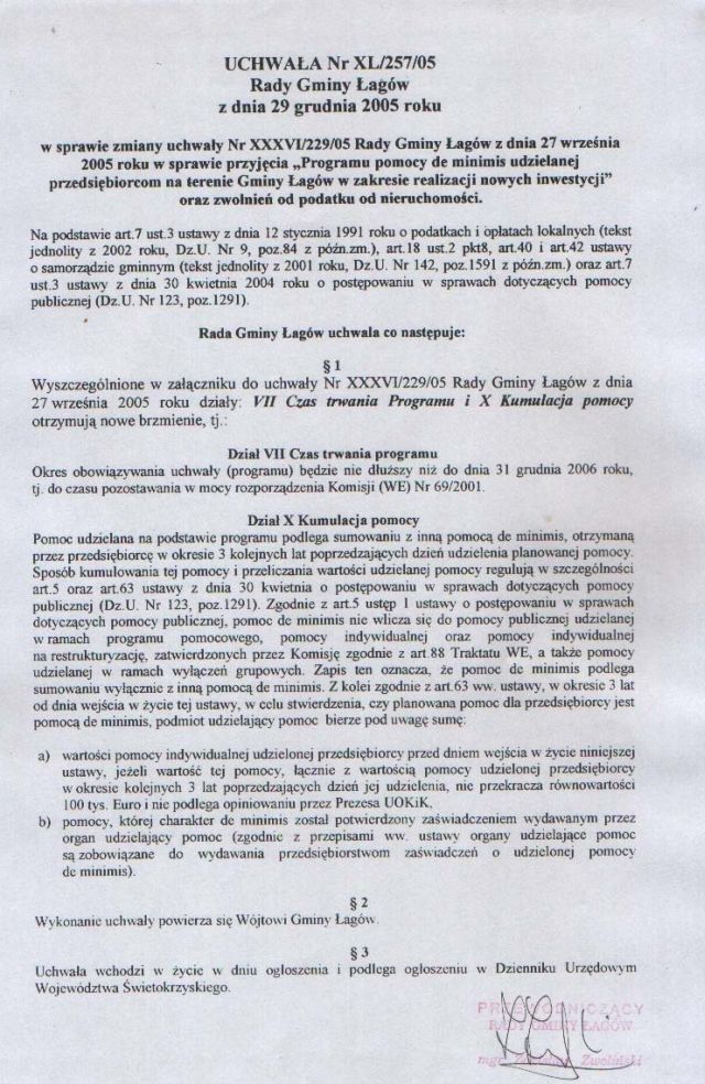 | Uchwała nr XL/257/05 Rady Gminy w Łagowie z dn. 29 grudnia 2005 r. w sprawie zmiany Uchwały Nr XXXVI/229/05 Rady Gminy Łagów z dnia 27 września 2005 roku. | 2008-10-22 |