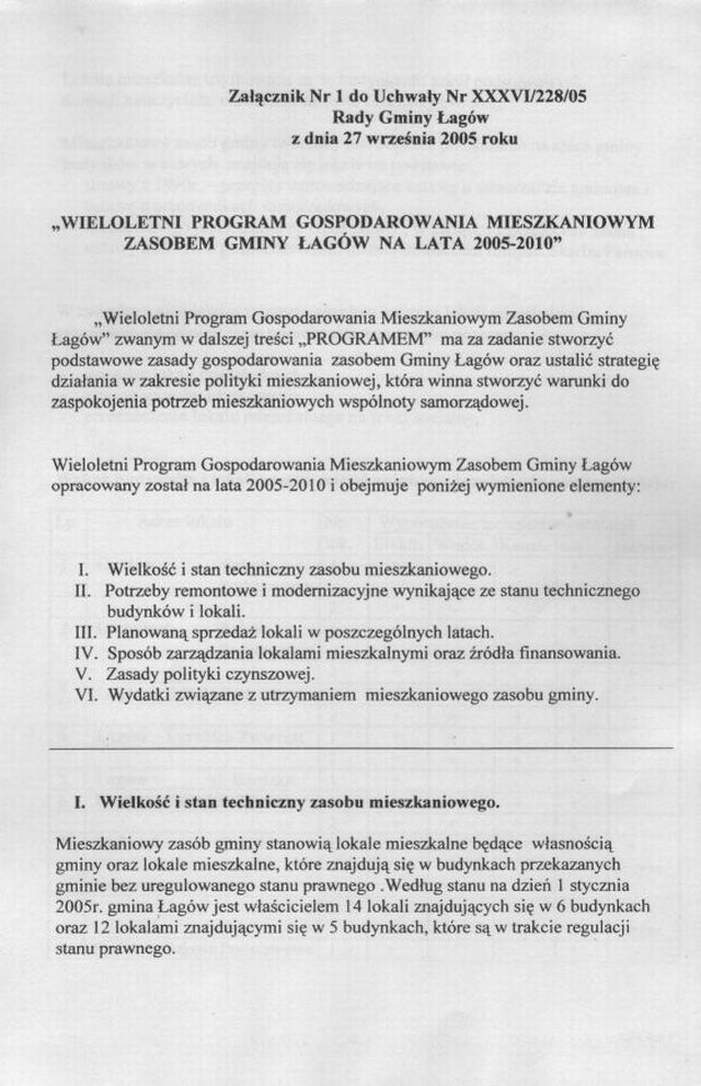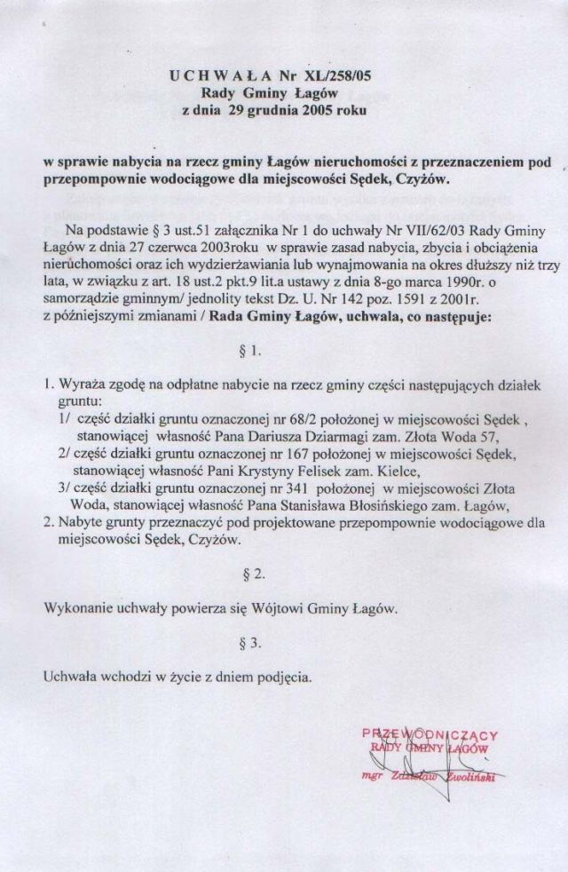 | Uchwała nr XL/258/05 Rady Gminy w Łagowie z dn. 29 grudnia 2005 r. w sprawie nabycia na rzecz gminy Łagów nieruchomości z przeznaczeniem pod przepompownie wodociągowe dla miejscowości Sędek, Czyżów. | 2008-10-22 |