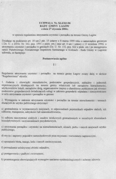 | Uchwała nr XLI/261/06 Rady Gminy Łagów z dn. 27 stycznia 2006 r.w sprawie regulaminu utrzymania czystości i porządku na terenie Gminy Łagów. | 2008-10-02 |