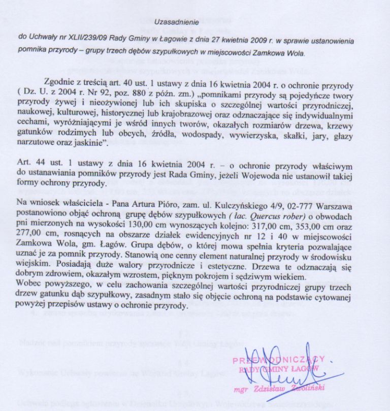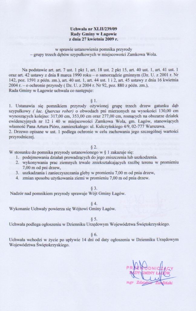 | Uchwała NR XLII/239/09 Rady Gminy w Łagowie z dnia 27 kwietnia 2009 r. w sprawie ustanowienia pomnika przyrody - grupy trzech dębów szypułkowych w miejscowości Zamkowa Wola | 2009-05-15 |