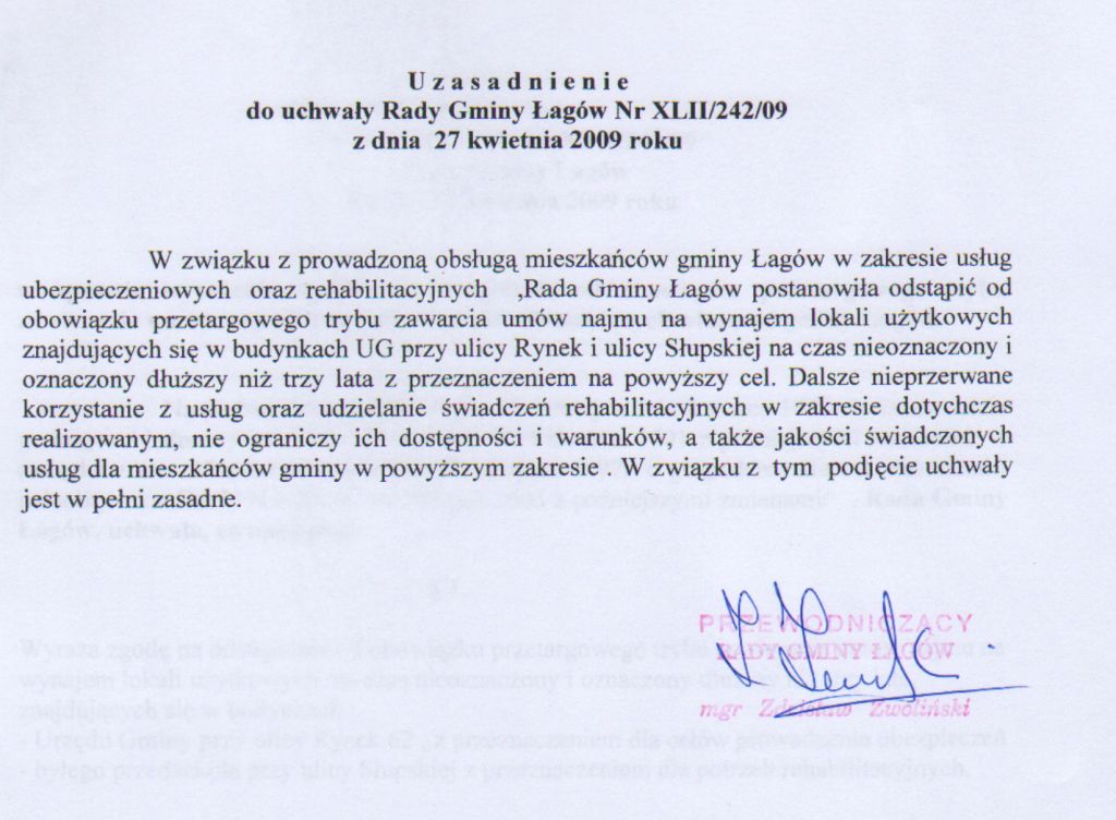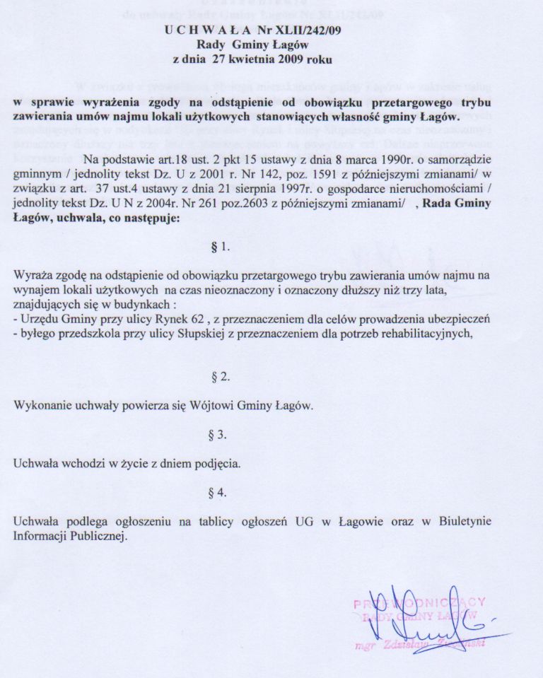 | Uchwała Nr XLII/242/09 Rady Gminy Łagów z dnia 27 kwietnia 2009 roki w sprawie wyrażenia zgody na odstąpienie od obowiązku przetargowego trybu zawierania umów najmu użytkowych stanowiących własność gminy Łagów | 2009-06-10 |