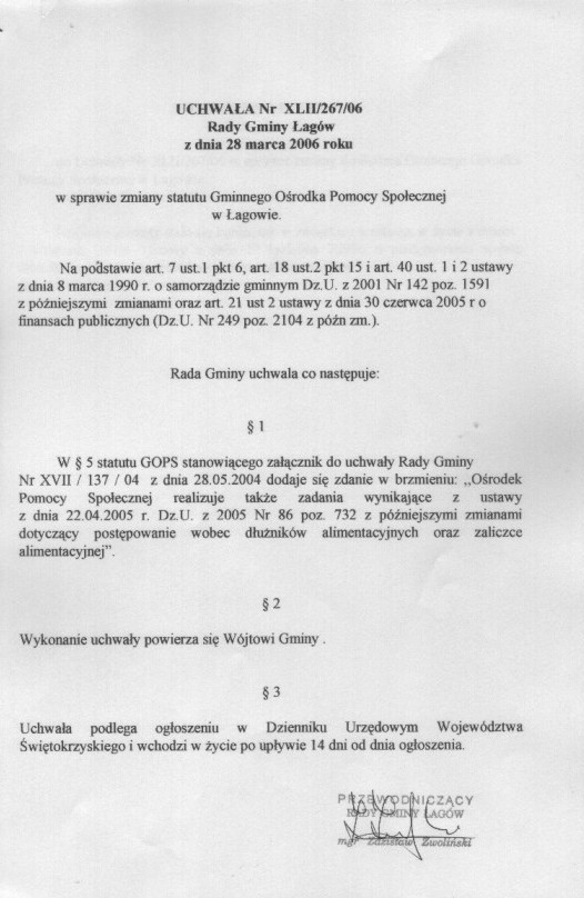 | Uchwała nr XLII/267/06 Rady Gminy Łagów z dn. 28 marca 2006 r. w sprawie zmiany statutu Gminnego Ośrodka Pomocy Społecznej w Łagowie. | 2008-10-02 |
