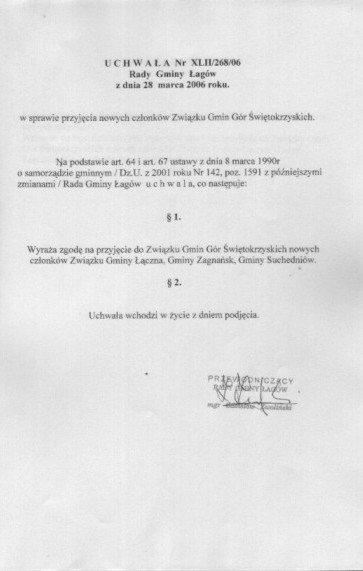 | Uchwała nr XLII/268/06 Rady Gminy Łagów z dn. 28 marca 2006 r. w sprawie przyjęcia nowych członków Związku Gmin Gór Świętokrzyskich. | 2008-10-02 |