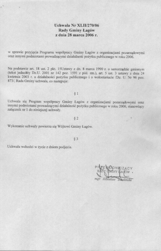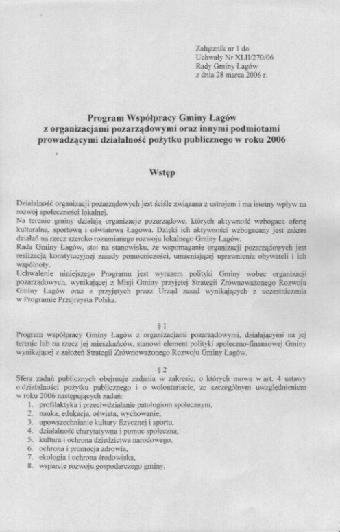 | Uchwała nr XLII/270/06 Rady Gminy Łagów z dn. 28 marca 2006 r. w sprawie przyjęcia Programu Współpracy Gminy Łagów z organizacjami pozarządowymi oraz innymi podmiotami prowadzącymi działalność pożytku publicznego w roku 2006. | 2008-10-02 |