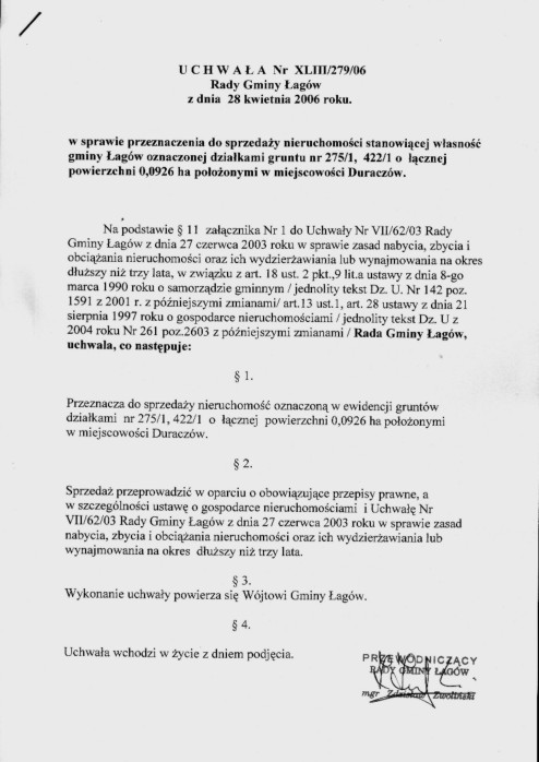 | Uchwała nr XLIII/279/06 Rady Gminy Łagów z dn. 28 kwietnia 2006 r. w sprawie przeznaczenia do sprzedaży nieruchomości stanowiącej własność gminy Łagów oznaczonej działkami gruntu nr 275/1, 422/1 położonych w m. Duraczów | 2008-10-02 |