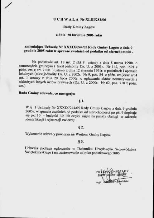 | Uchwała nr XLIII/281/06 Rady Gminy Łagów z dn. 28 kwietnia 2006 r. zmieniająca Uchwałę Nr XXXIX/244/05 Rady Gminy Łagów z dnia 9 grudnia 2005 roku w sprawie zwolnieĂą od podatku od nieruchomości. | 2008-10-02 |