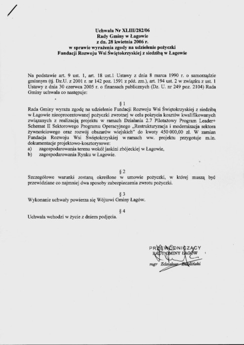 | Uchwała nr XLIII/282/06 Rady Gminy Łagów z dn. 28 kwietnia 2006 r. w sprawie wyrażenia zgody na udzielenie pożyczki Fundacji Rozwoju Wsi Świętokrzyskiej z siedzibą w Łagowie. | 2008-10-02 |