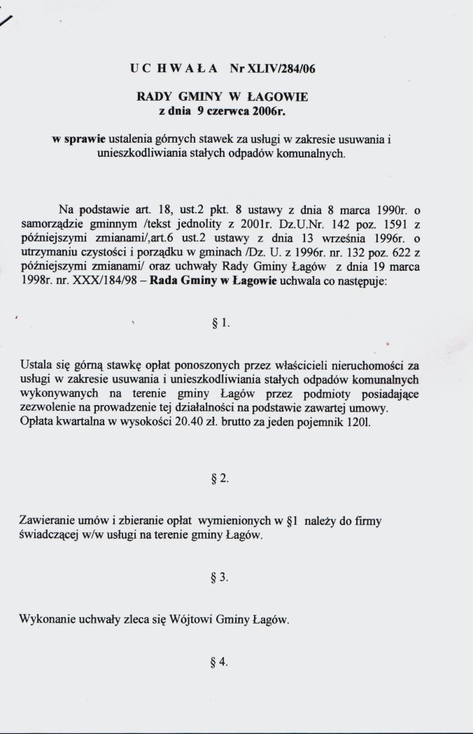| Uchwała nr XLIV/284/06 Rady Gminy Łagów z dn. 9 czerwca 2006 r. w sprawie ustalenia górnych stawek za usługi w zakresie usuwania i unieszkodliwiania stałych odpadów komunalnych. | 2008-10-02 |
