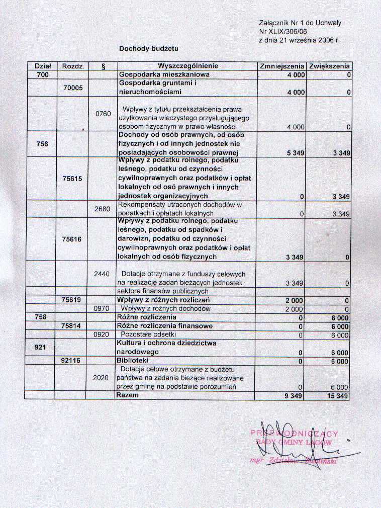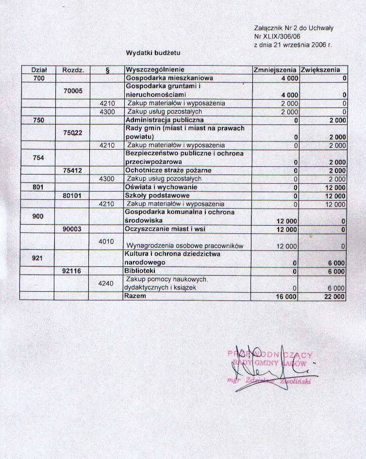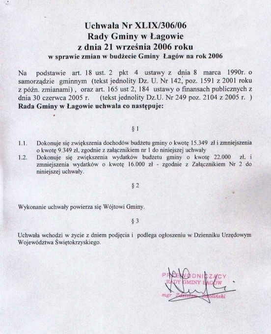 | Uchwała nr XLIX/306/06 Rady Gminy w Łagowie z dn. 21 września 2006 r. w sprawie zmian w budżecie Gminy Łagów na rok 2006. | 2008-10-02 |