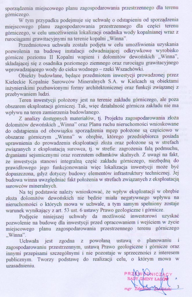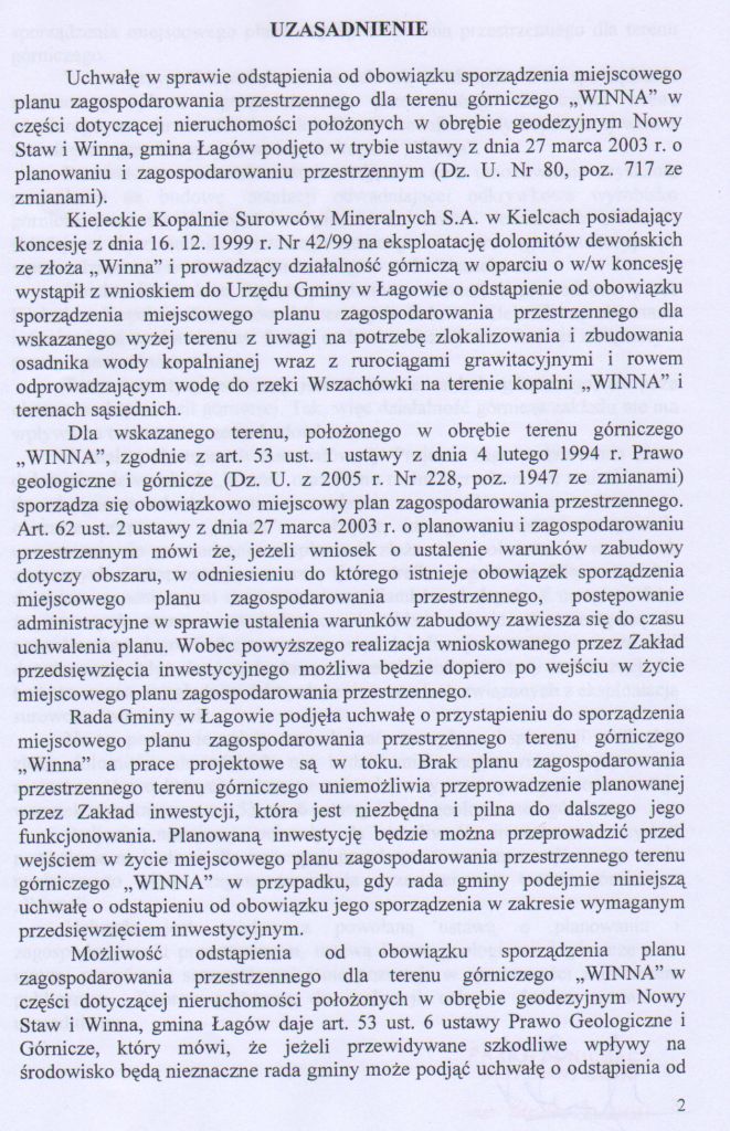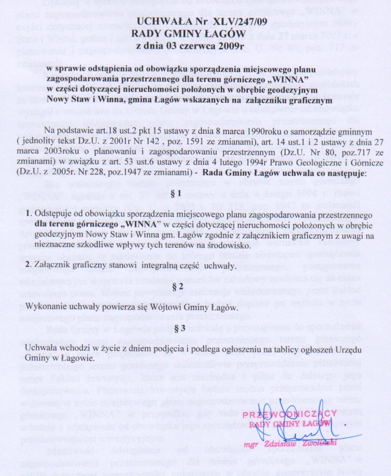| Uchwała nr XLV/247/09 Rady Gminy Łagów z dnia 3 czerwca 2009 r. w sprawie odstąpienia od obowiązku sporządzenia miejscowego planu zagospodarowania przestrzennego dla terenu górniczego "WINNA"... | 2009-06-16 |