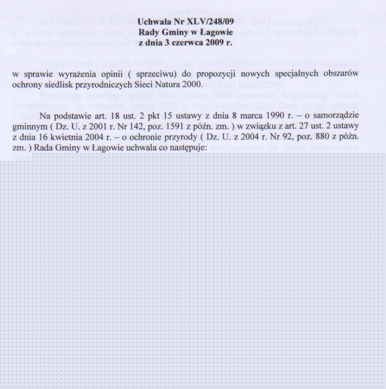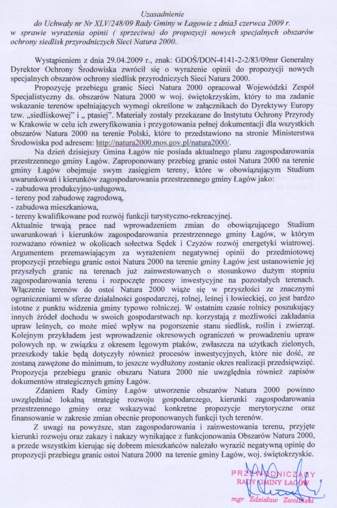 | Uchwała nr XLV/248/09 Rady Gminy Łagów z dnia 3 czerwca 2009 r. w sprawie wyrażenia opinii (sprzeciwu) do propozycji nowych specjalnych obszarów ochrony siedlisk przyrodniczych Natrura 2000 | 2009-06-16 |