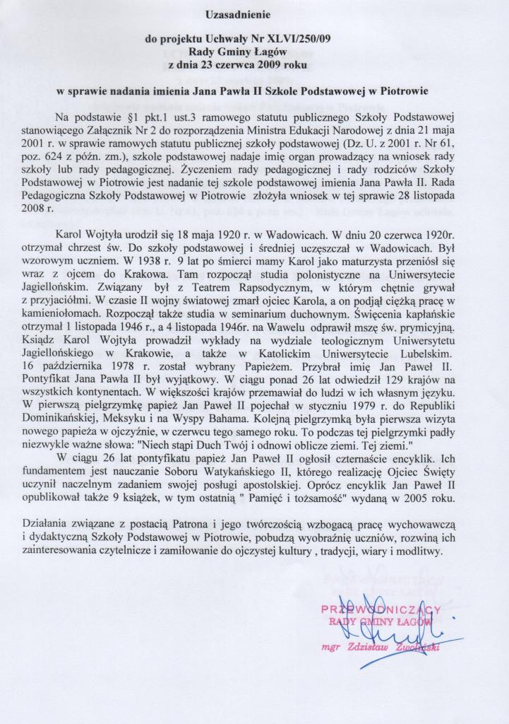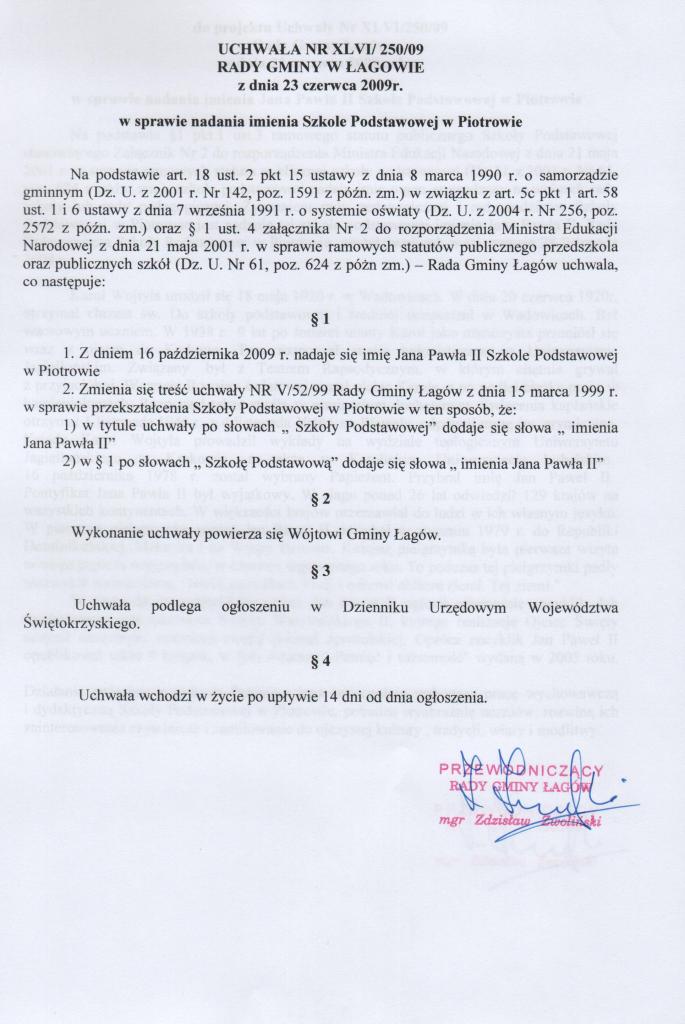 | Uchwała nr XLVI/250/09 Rady Gminy w Łagowie z dnia 23 czerwca 2009r. w sprawie nadania imienia Szkole Podstawowej w Piotrowie | 2009-07-20 |