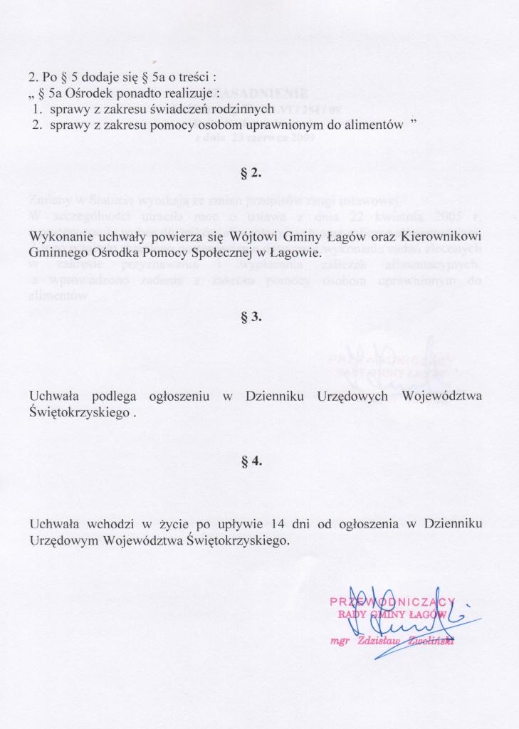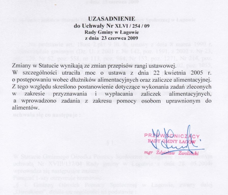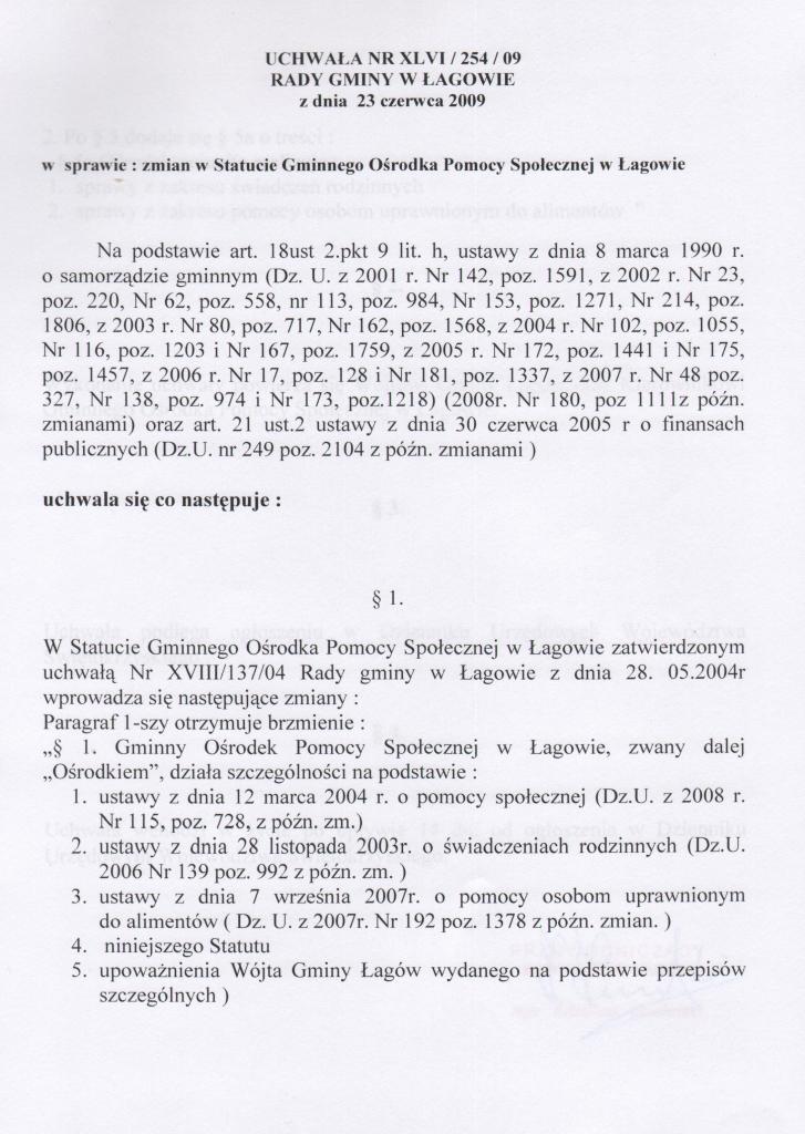 | Uchwała nr XLVI/254/09 Rady Gminy Łagów z dnia 23 czerwca 2009r. w sprawie zmian w statucie Gminnego Ośrodka Pomocy Społecznej w Łagowie | 2009-07-20 |